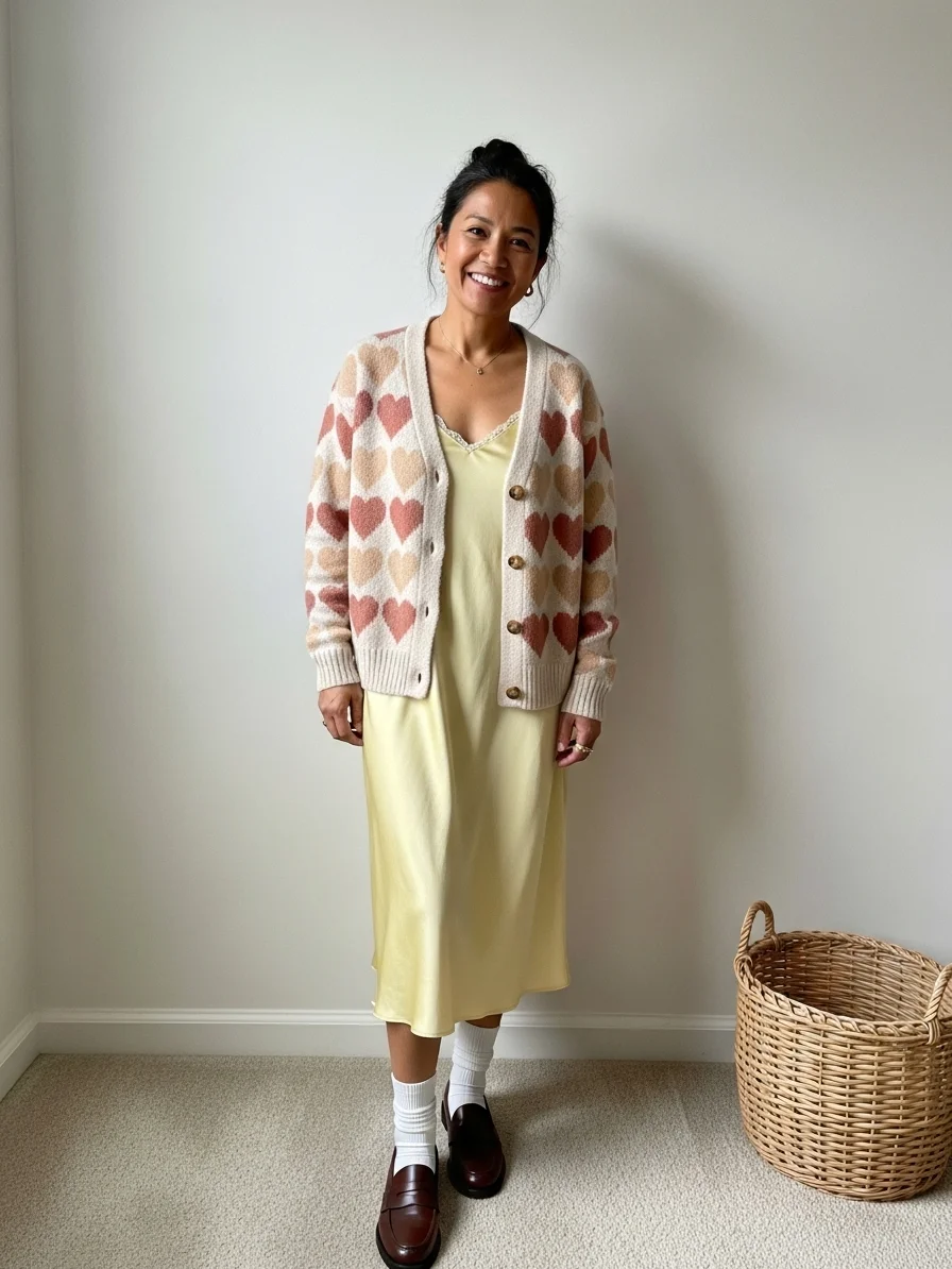 A heart-patterned cardigan brings playful personality to a sleek slip dress, creating a layered look full of warmth and charm. Ankle socks and loafers add a preppy finish, making the outfit feel youthful, cozy, and visually delightful.