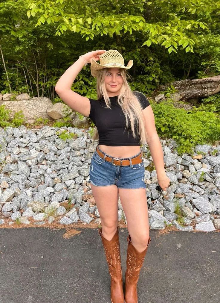 A straw cowboy hat and layered jewelry enhance the relaxed country vibe, making it perfect for outdoor events or bonfires.