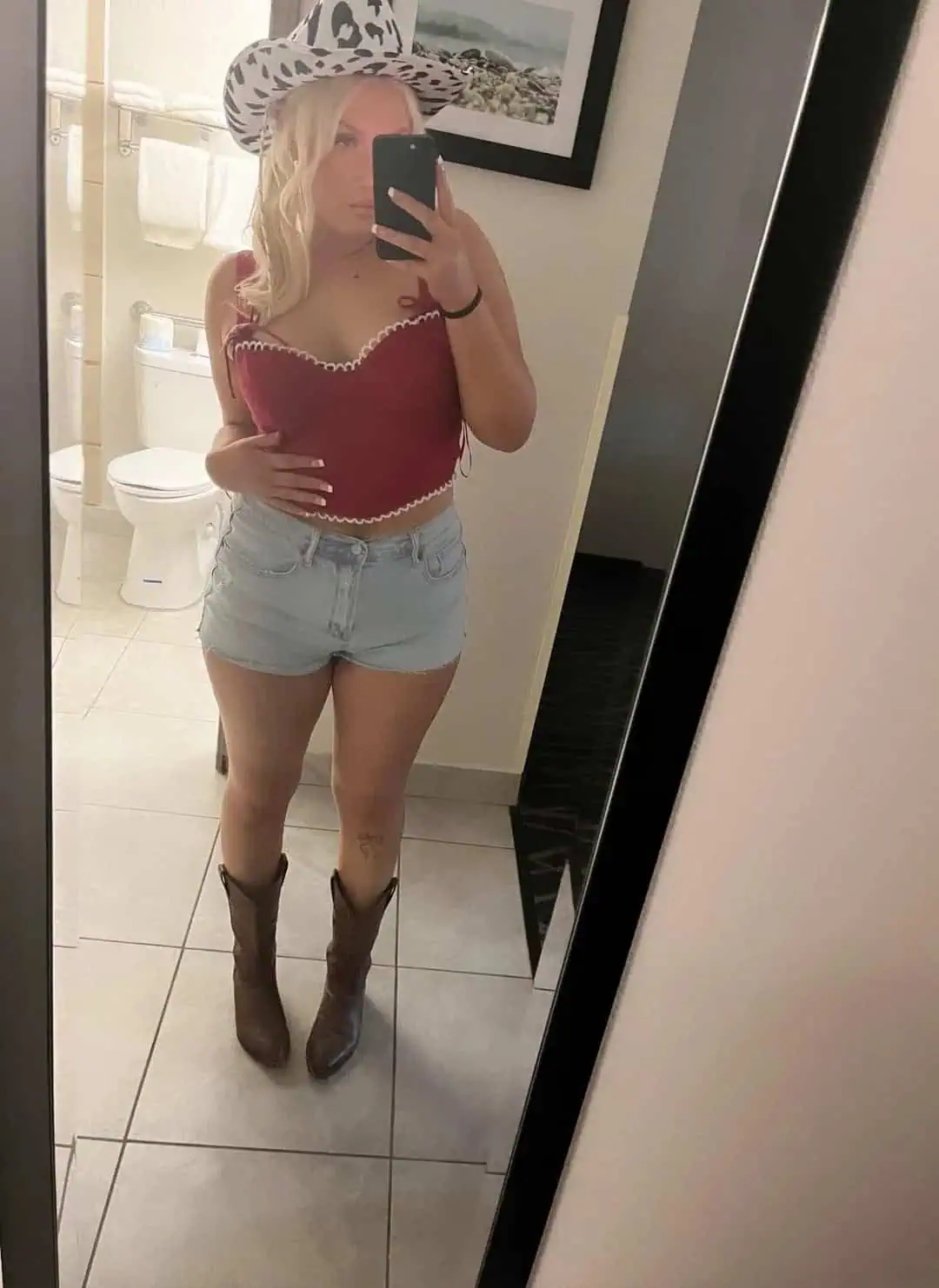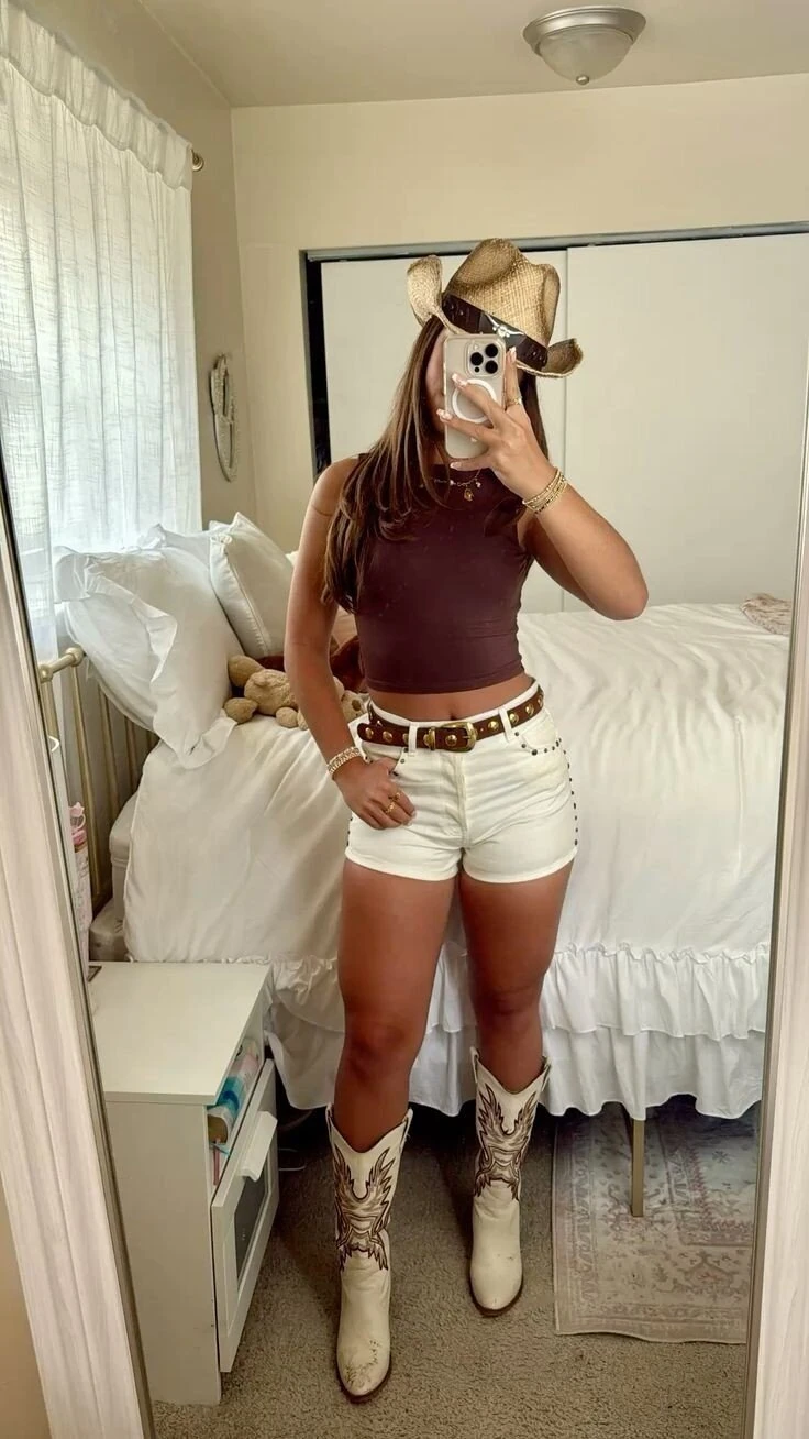 Paired with white boots and a cream cowboy hat, the outfit feels bold and fun while still fitting perfectly into a lively country event.