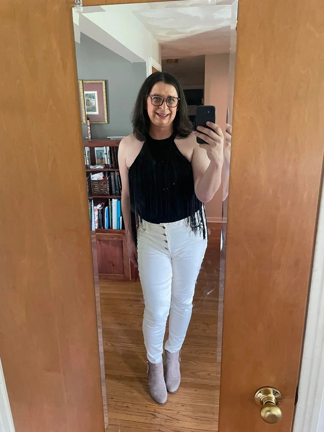 White skinny jeans and suede ankle boots create a sleek base that allows the fringe to remain the focal point of the look.