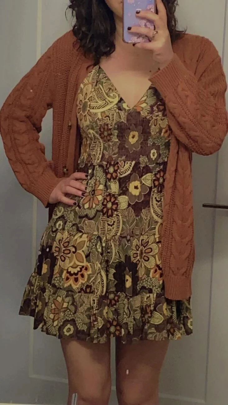 A dark floral midi dress paired with a rust-colored cardigan creates a cozy and charming country-inspired outfit.