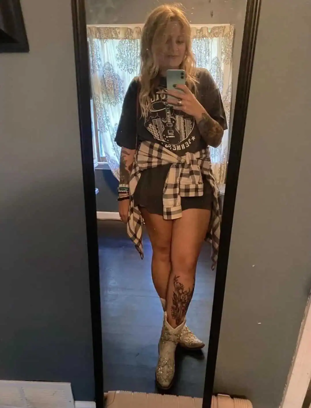 A vintage-style band tee combined with a plaid shirt tied around the waist creates a relaxed and slightly edgy country look.