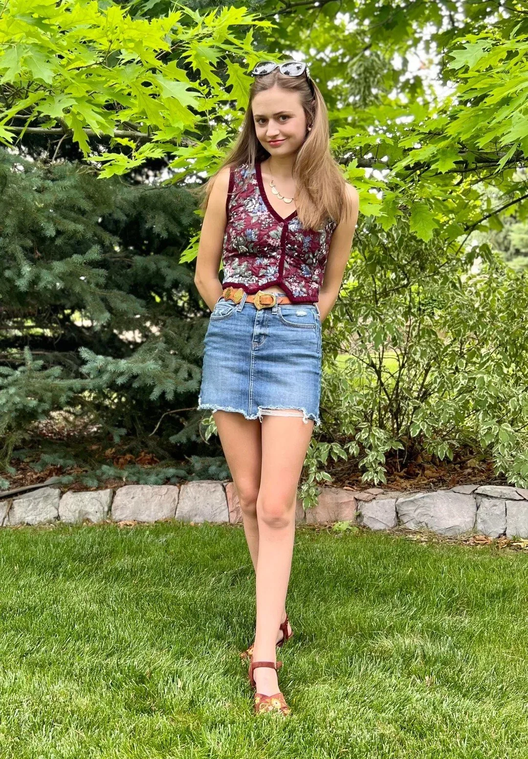A burgundy floral tank top styled with a distressed denim mini skirt offers a simple yet polished summer look.
