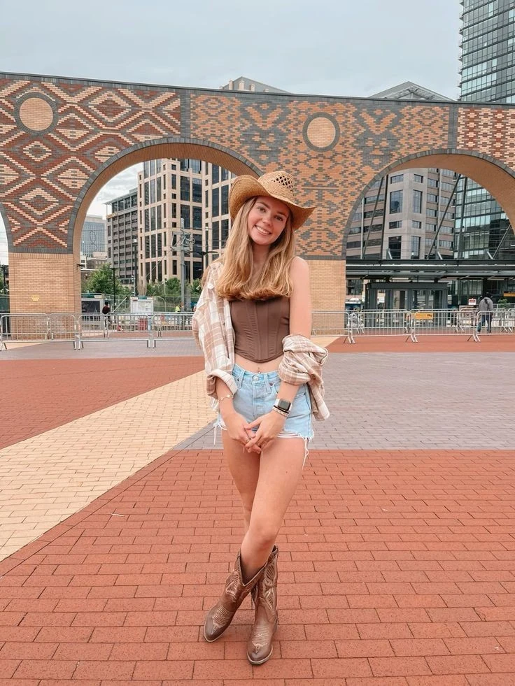 Suede ankle boots and a black cowboy hat complete the outfit with a classic western touch that works perfectly for concerts or backyard gatherings.