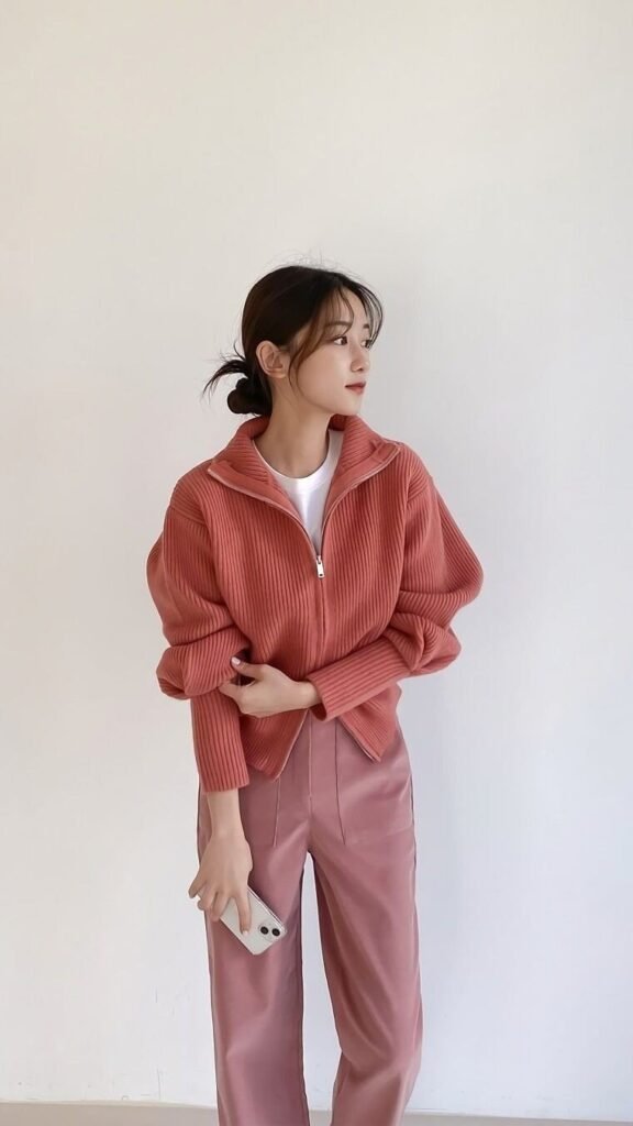 The cropped dusty rose jacket layered over a white tee and soft mauve trousers creates a monochromatic look that is cozy yet chic. The outfit demonstrates how muted tones can be sophisticated while remaining versatile for coffee runs, casual office days, or winter strolls. The relaxed silhouette maintains comfort without sacrificing style.