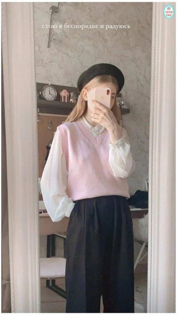 A pink knit vest layered over a white collared shirt combines preppy sophistication with winter practicality. Dark trousers or skirts make the outfit versatile for day-to-night transitions. Accessories like a black beret keep the look polished while maintaining warmth, showing casual winter outfits can be both functional and stylish.