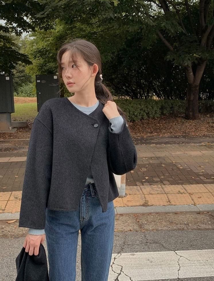 A warm-toned cropped blazer layered over a gray top and paired with wide-leg jeans creates a structured yet relaxed winter casual look. The outfit balances intentional style with comfort, making it perfect for casual office settings or weekend meetups. The cropped silhouette prevents heaviness, while the blazer adds polish.