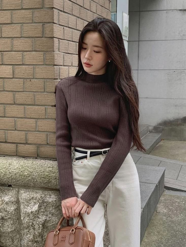 This rich chocolate turtleneck offers warmth and visual texture, complemented by cream trousers for a sophisticated contrast. The outfit demonstrates how a fitted top and tailored bottoms create a polished silhouette, perfect for transitioning from office settings to weekend plans without compromising comfort. Accessories like a contrasting belt subtly elevate the ensemble.