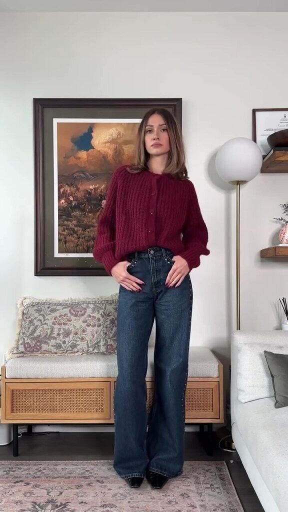 A deep burgundy cable-knit sweater with dark wide-leg jeans provides warmth and timeless style. Relaxed silhouettes ensure mobility and comfort, while the simple combination of basics offers effortless winter casual elegance suitable for indoor or outdoor activities.