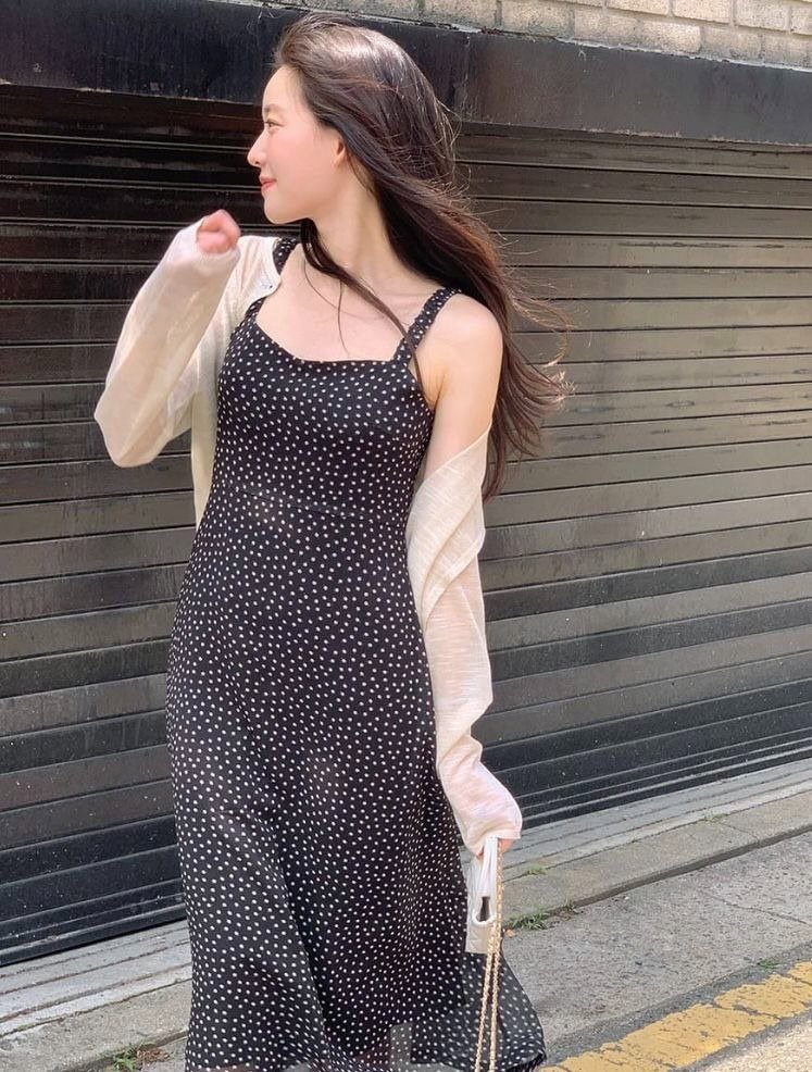 A black polka dot slip dress paired with an oversized cream cardigan creates warmth without compromising elegance. Layered tights and boots add practicality, while the dark-and-light contrast offers a visually appealing, intentional winter outfit suitable for casual winter outings.