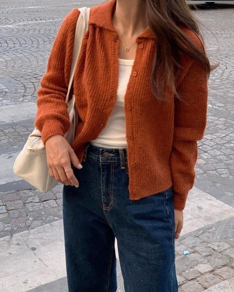 Burnt orange cardigans layered over white tees create visual contrast against dark denim, adding warmth and modernity. Textured knits give dimension, while sneakers or boots complete a casual yet polished look. This combination demonstrates how layering smartly can turn everyday winter pieces into stylish staples.