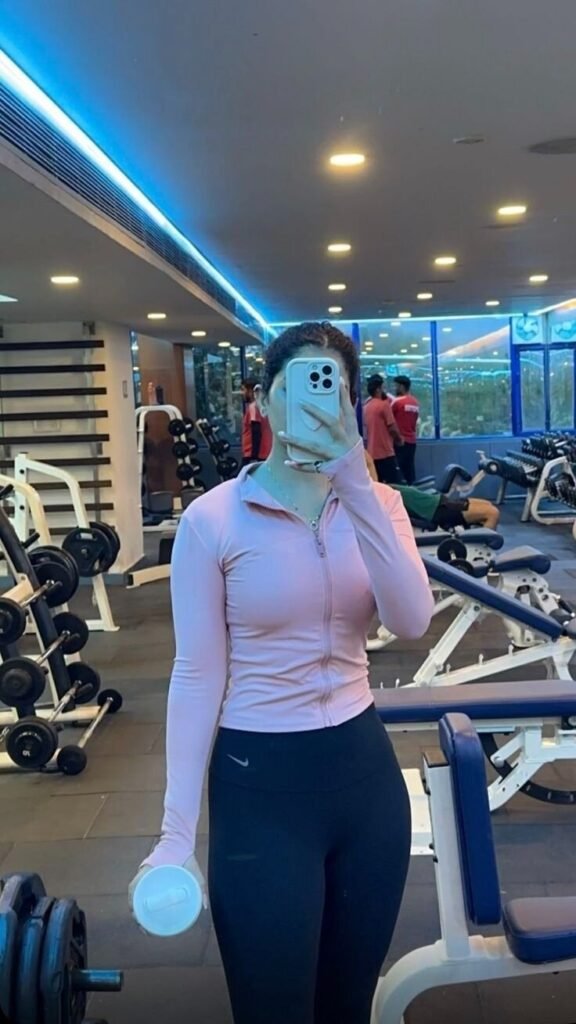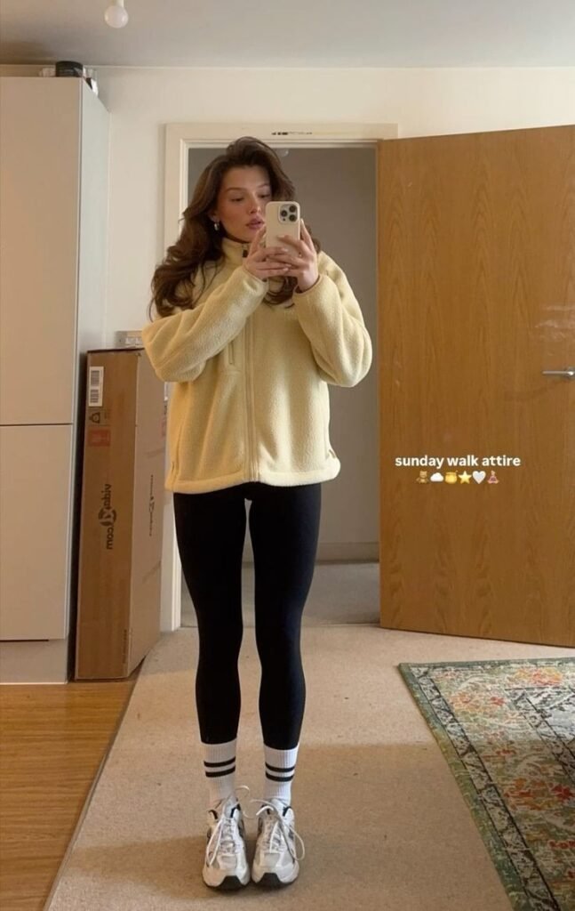 The fitted leggings keep movement unrestricted. The look reinforces that winter gym outfits can be both practical and visually sharp.