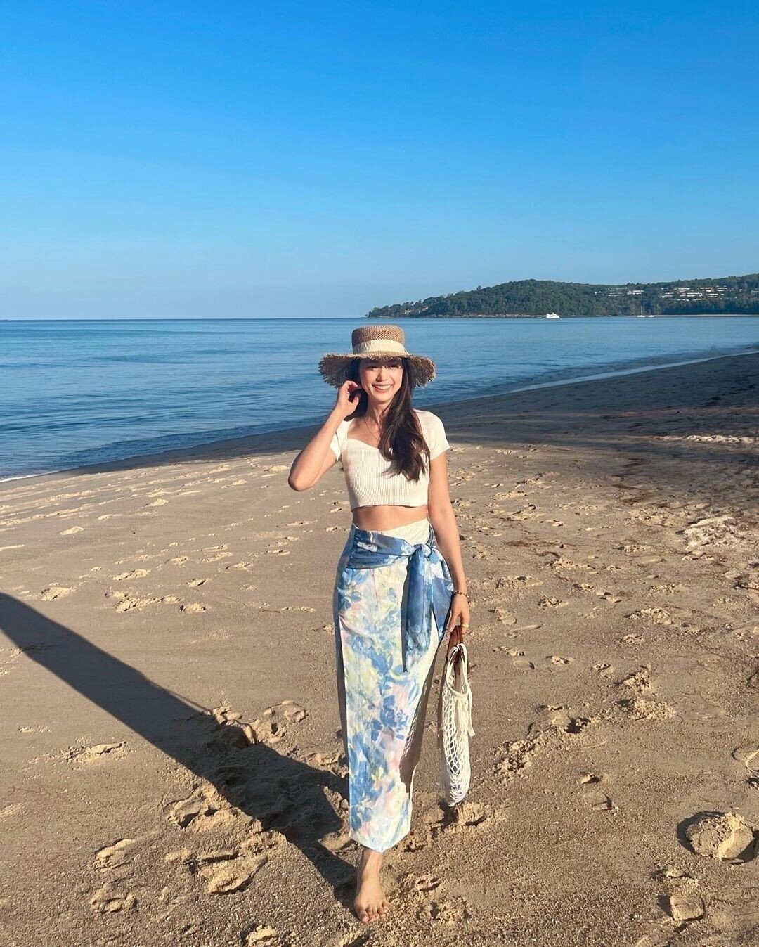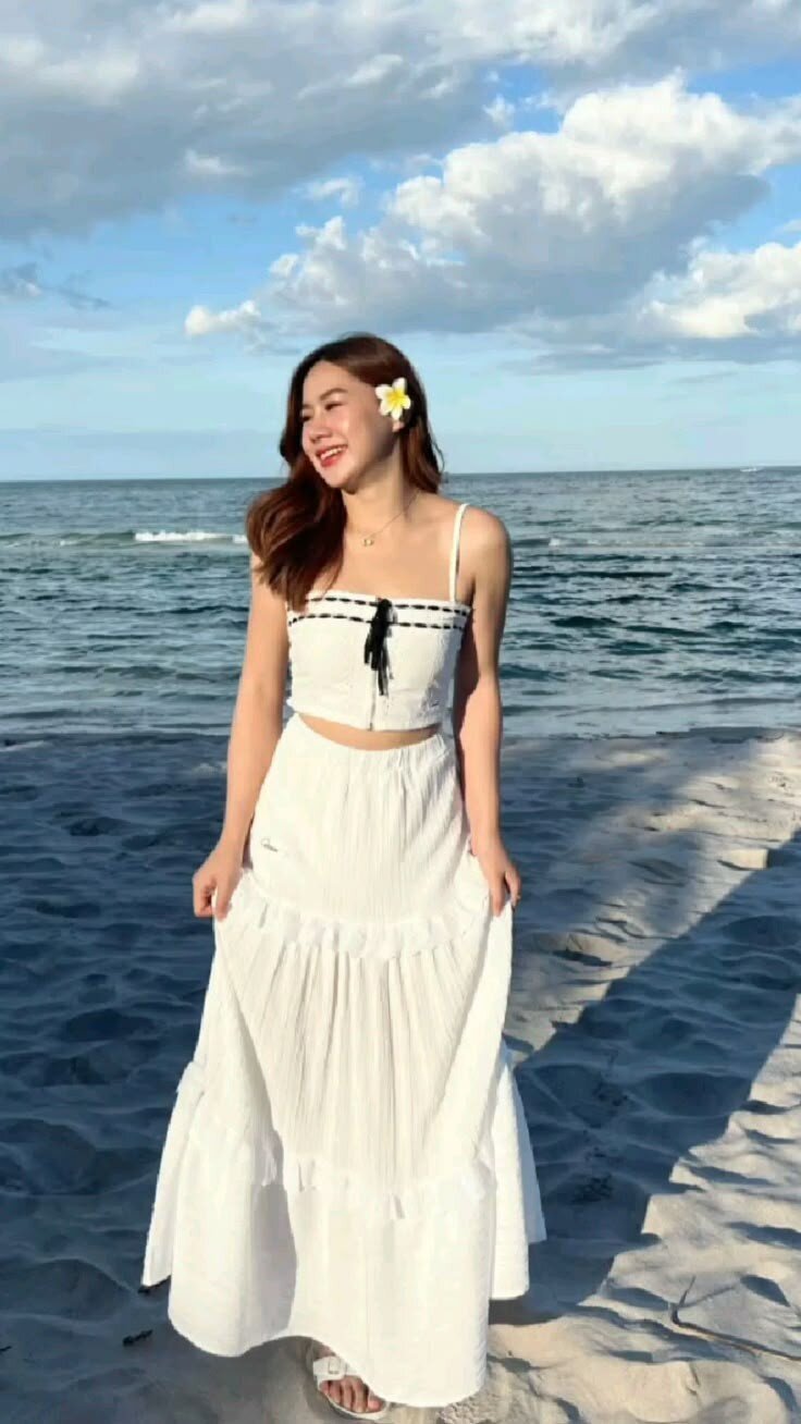 A coordinated white crop top and flowing maxi skirt creates an instantly elegant beach statement. The structured top balances the movement of the skirt, while the airy fabric keeps everything cool and comfortable in the heat. Simple sandals and delicate accessories complete a look that feels refined without trying too hard, making it perfect for beach walks or sunset dinners by the water.