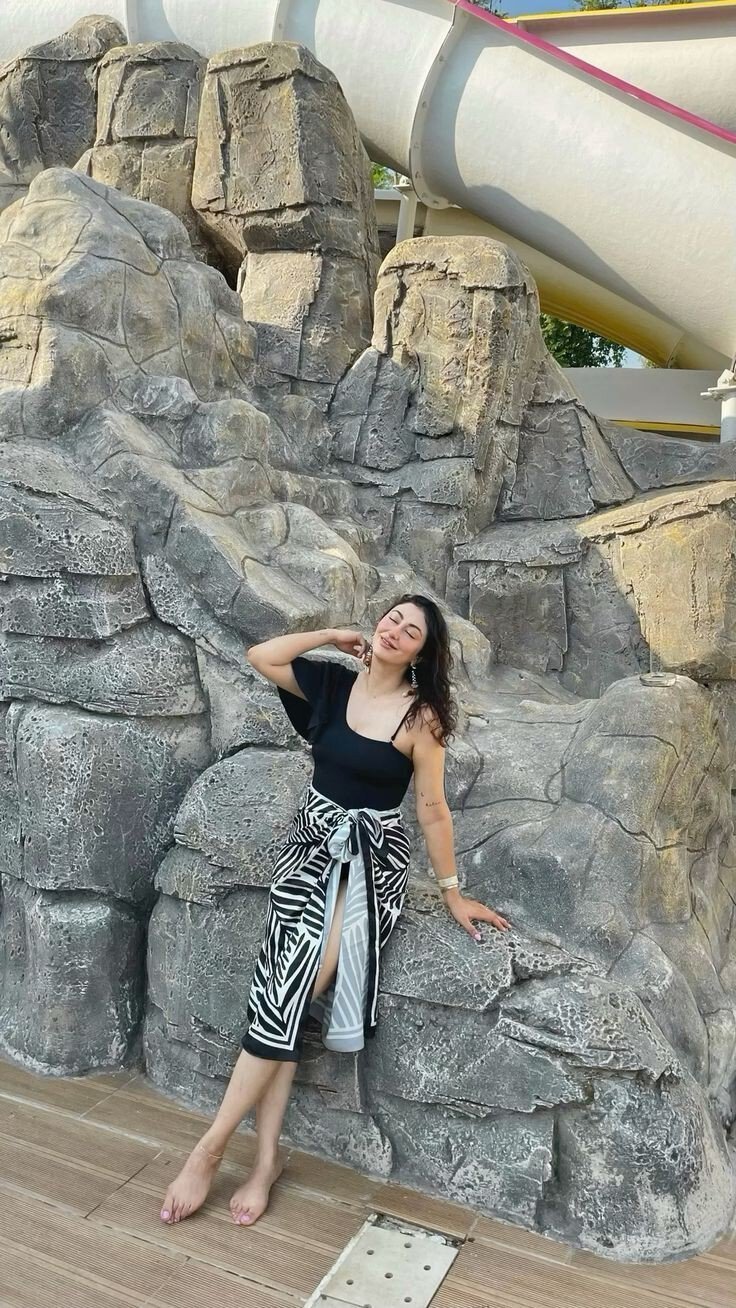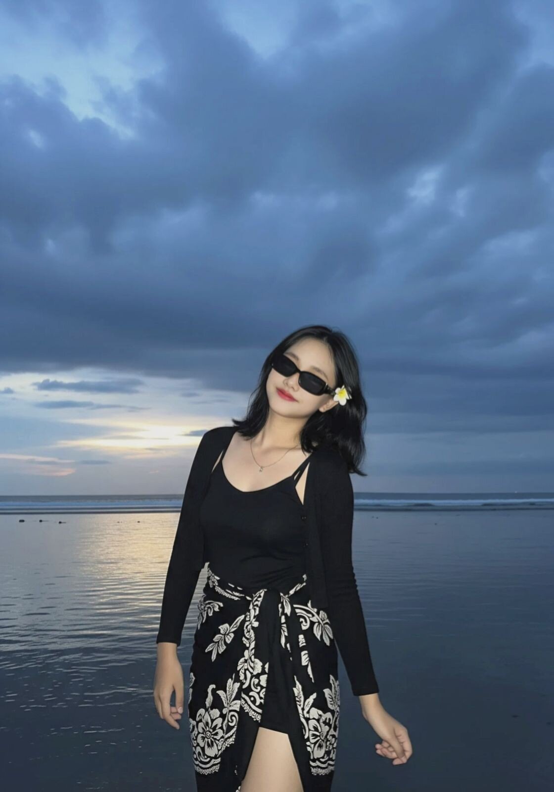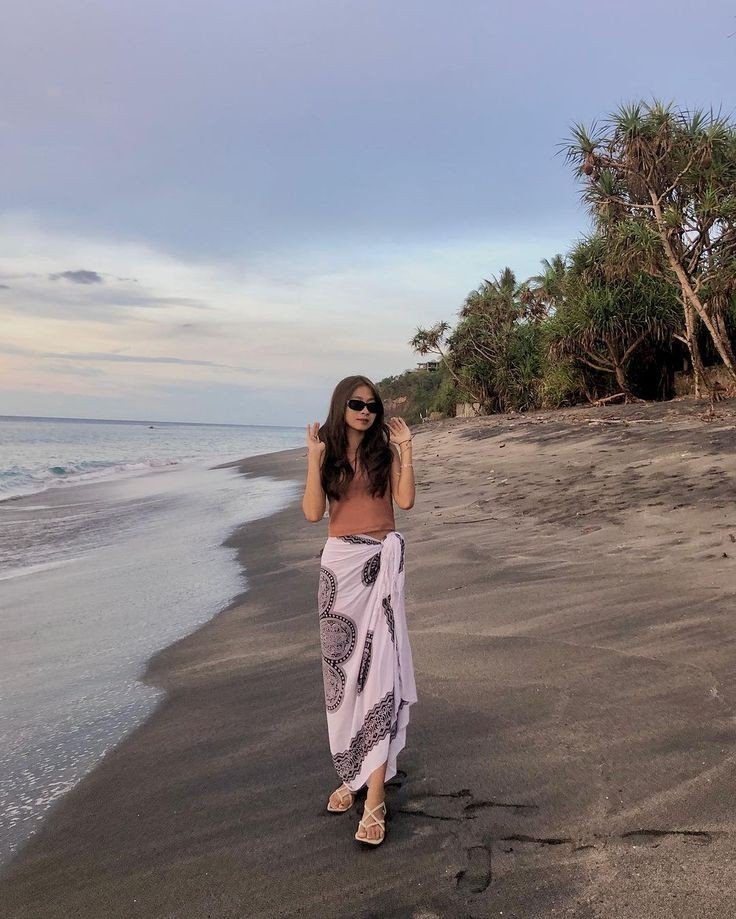 A long-sleeve black top with a patterned white wrap skirt creates understated drama. The monochrome palette feels timeless and refined, proving that beach fashion doesn’t need bright colors to stand out. Ideal for sunset strolls or seaside photography, this look finishes the list with effortless sophistication.