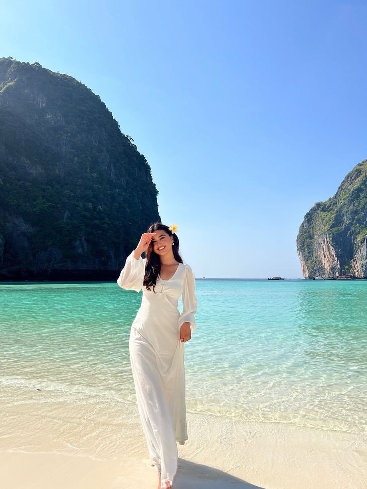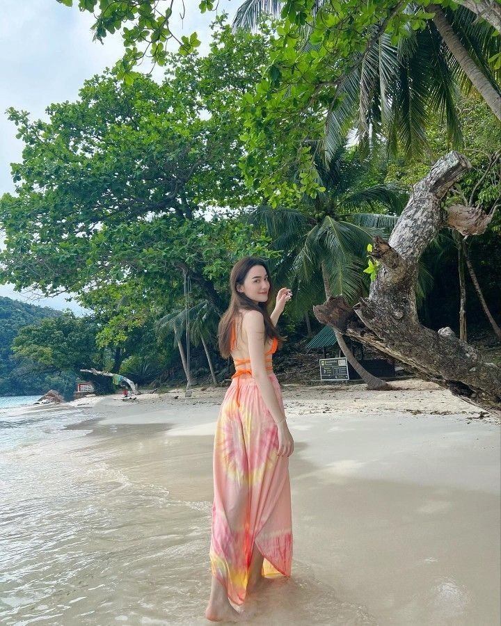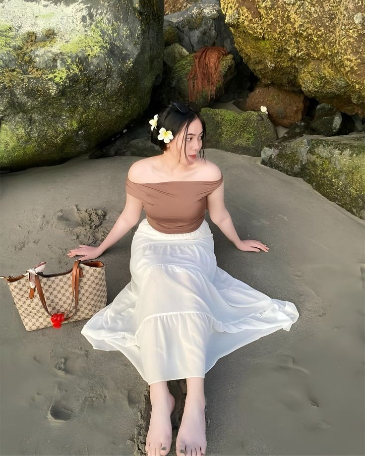 A caramel-toned off-shoulder top paired with a soft white skirt forms a dreamy, romantic silhouette. Comfortable yet photogenic, this outfit suits everything from relaxed beach afternoons to golden-hour photos by the shore.