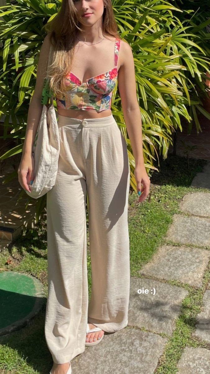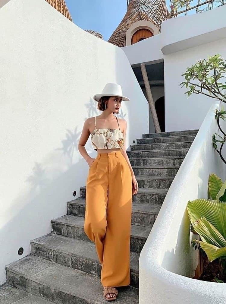Warm golden trousers paired with a delicate floral top create a standout color combination. The wide-leg shape allows airflow and movement, while the romantic print keeps the look soft and summery—ideal for beachside evenings or coastal exploring.