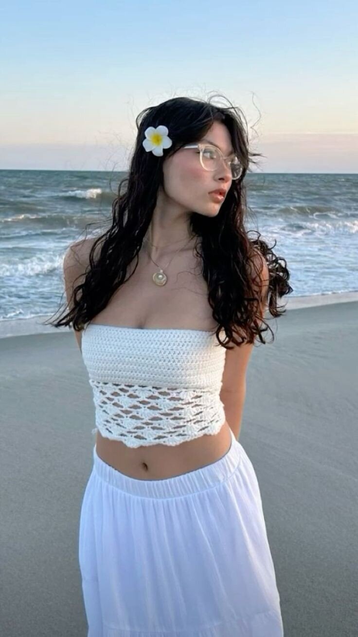 An off-shoulder crochet crop top styled with a flowing white skirt creates romantic beach charm. Textured fabric adds interest while remaining breathable in warm weather. Soft accessories and delicate jewelry enhance the relaxed elegance.