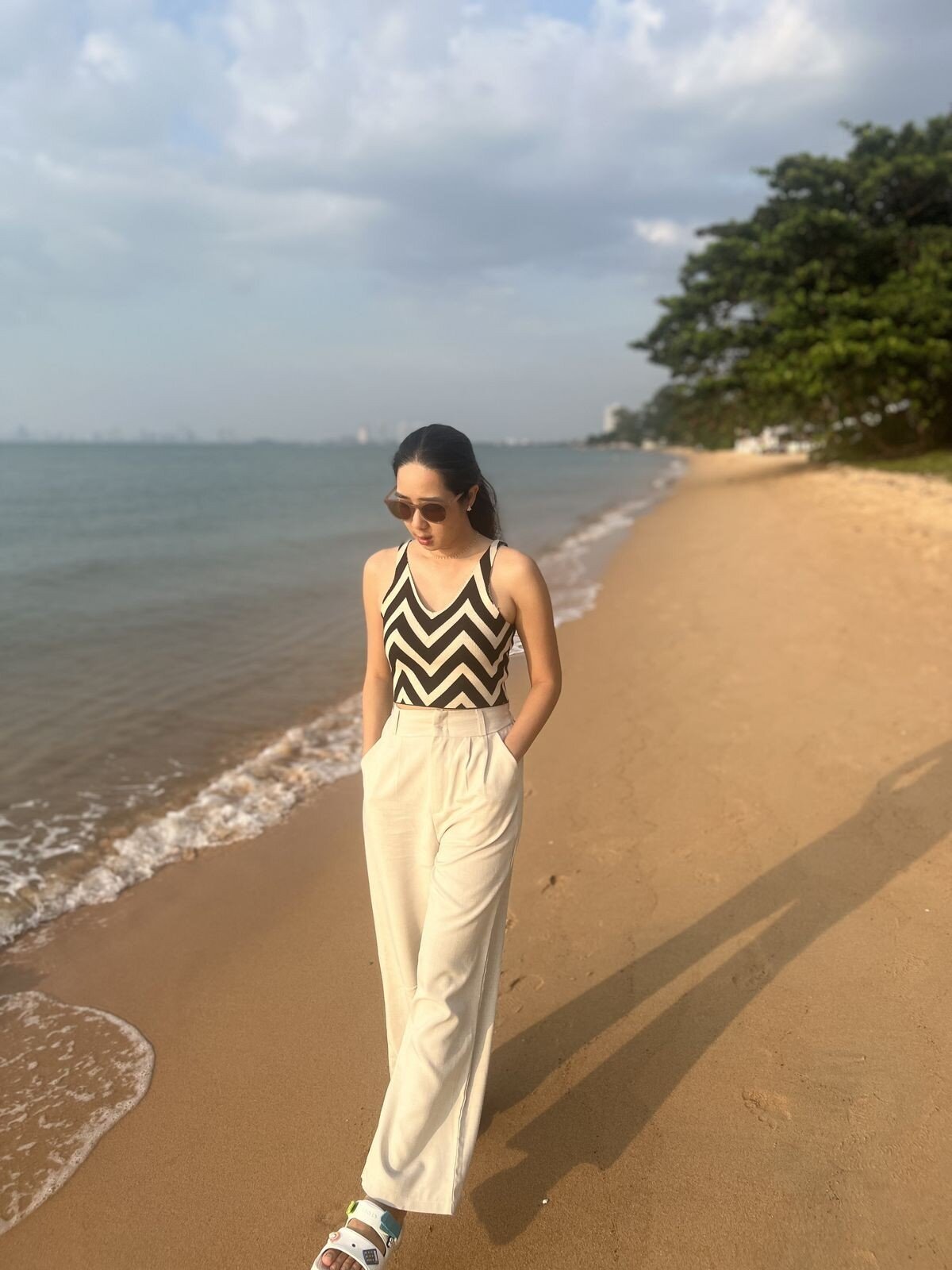 Graphic black-and-white chevron patterns bring bold contrast to soft cream trousers. The structured tank anchors the flowing silhouette below, resulting in a refined yet comfortable beach outfit that works beyond the shoreline.