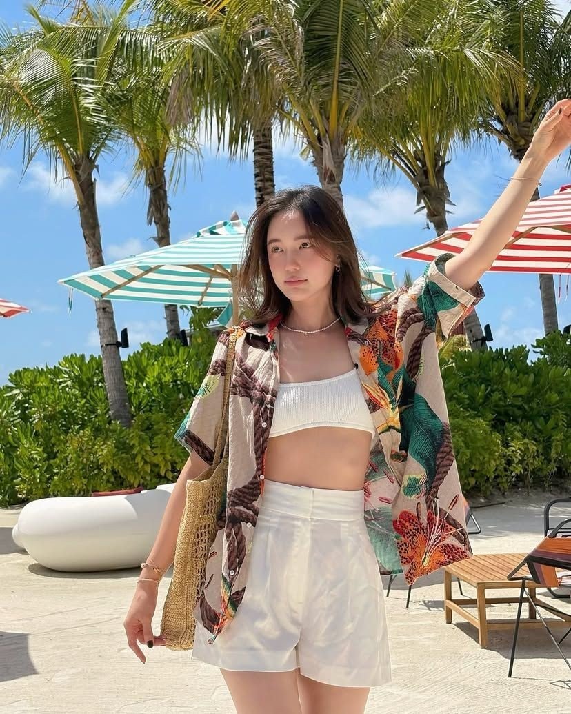 Layering a vibrant floral shirt over a simple ribbed crop top and linen shorts creates dimension without heaviness. The relaxed structure keeps things cool, while subtle accessories add a hint of sophistication suitable for dining or strolling.