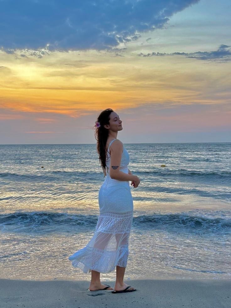 A fitted crochet bodice flowing into a sheer skirt creates graceful movement in ocean breezes. The timeless white shade reflects sunlight and photographs beautifully, making it a stunning choice for evening beach walks or seaside dinners.