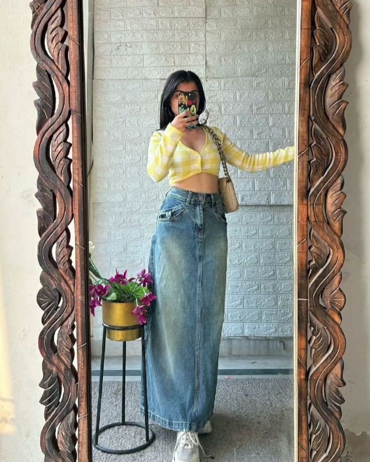 A bright cropped top paired with a denim maxi skirt blends youthful energy with classic balance. The fitted top adds playfulness, while the long skirt keeps it grounded and polished. The mix creates a confident, modern silhouette suitable for casual or dressed-up dates.