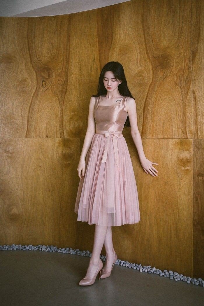 A matching pink top and skirt create a seamless, graceful look. The soft color feels gentle and romantic, while the coordinated design keeps everything polished. Simple styling makes it relaxed yet elegant — perfect for an easygoing evening out.