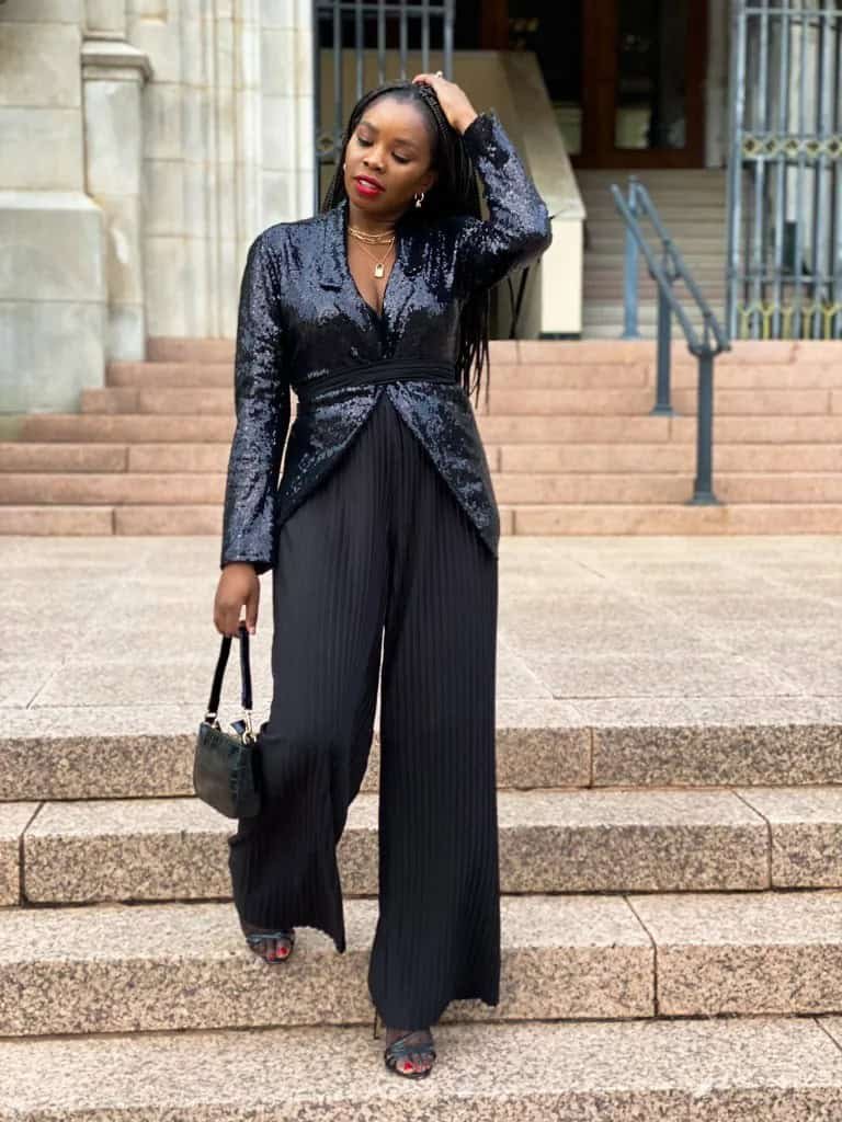A sequined blazer layered over a wide-leg jumpsuit blends sparkle with structure. The result is festive yet refined, perfect for standing out while still looking office-appropriate.