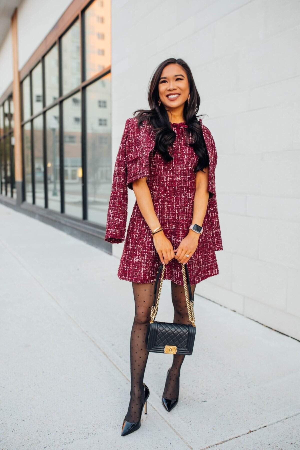 A burgundy tweed cape dress feels festive and sophisticated. The cape sleeves add drama, while sheer tights and classic pumps keep it office-appropriate. A quilted bag completes this elegant holiday-ready look.
