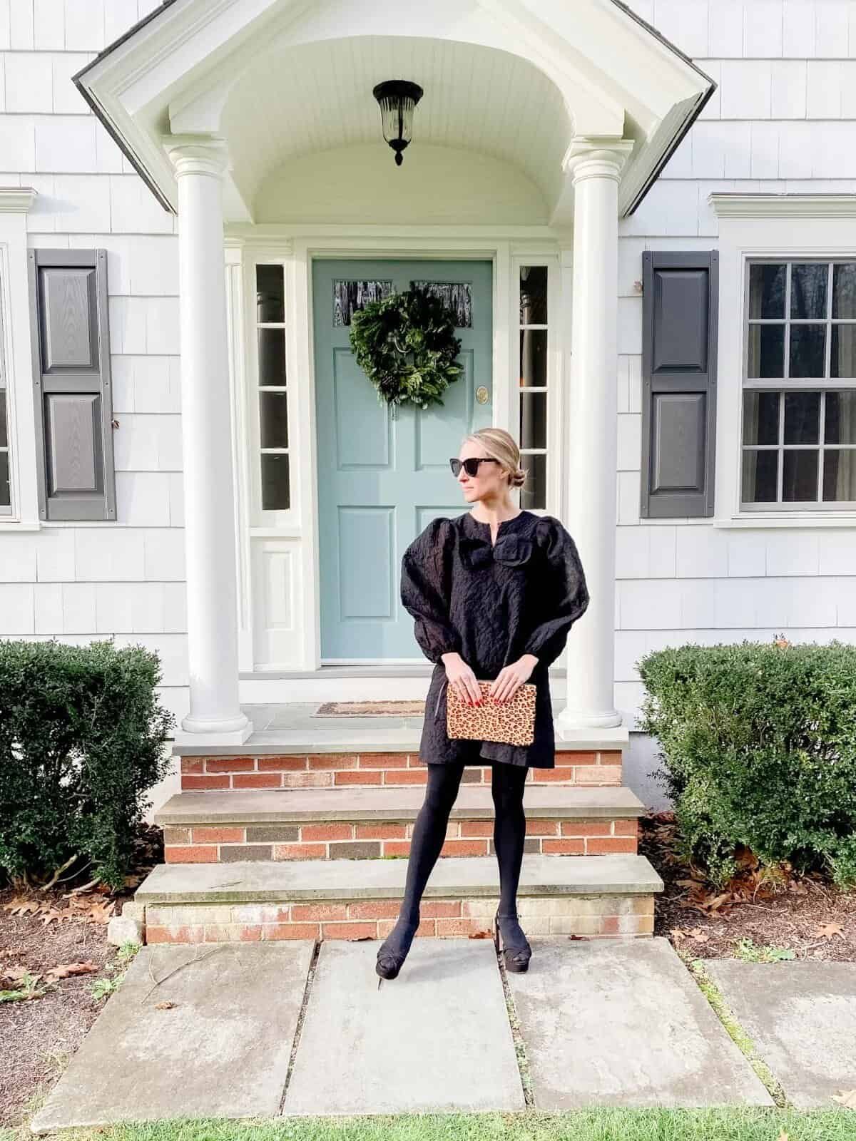 A black mini dress with puff sleeves feels glamorous and structured. Paired with tights and heels, it stays sophisticated. A printed clutch adds personality to an otherwise timeless look.