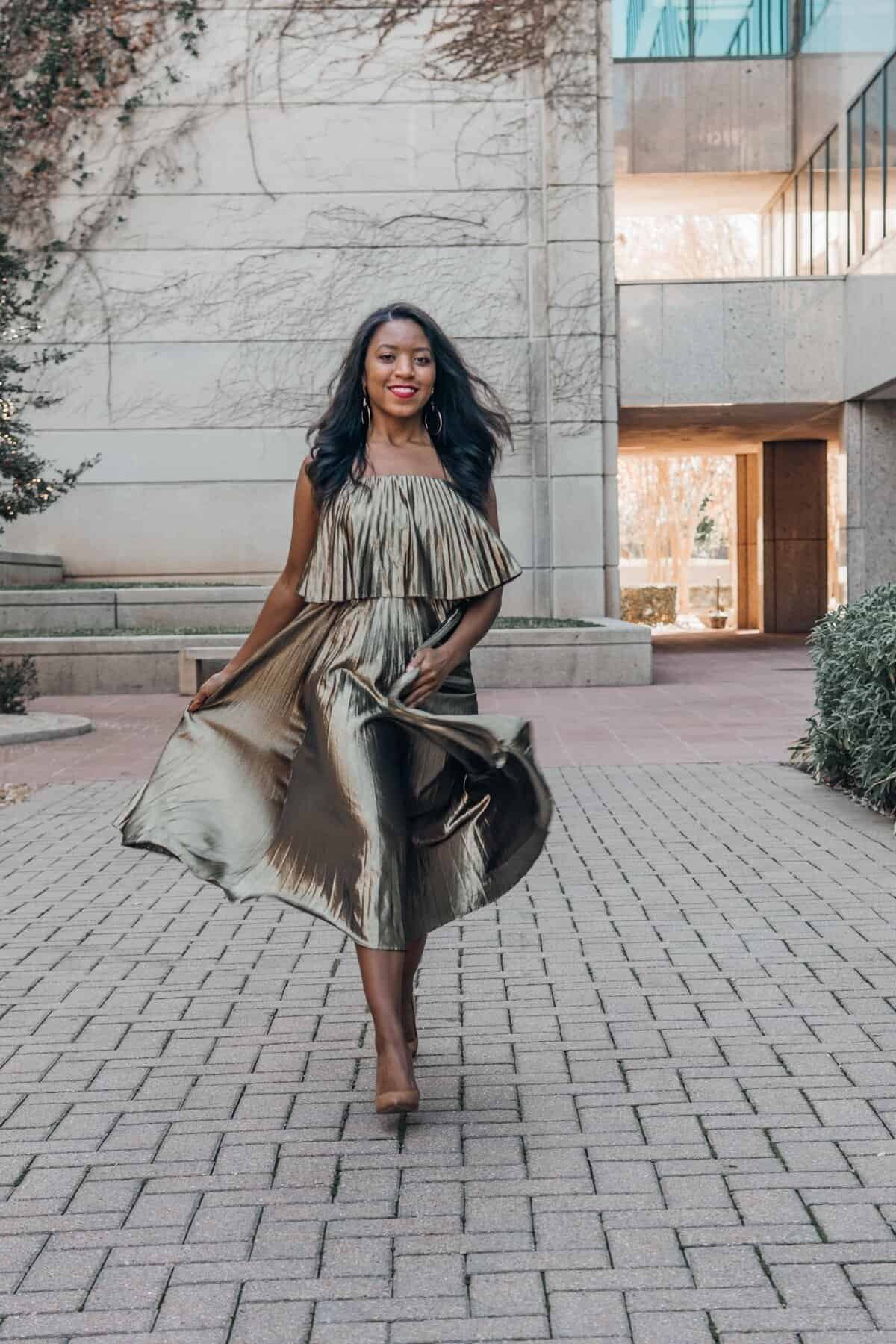 A metallic pleated dress catches the light beautifully. The off-shoulder detail adds softness, while simple heels and earrings keep the outfit balanced and elegant for a work event.
