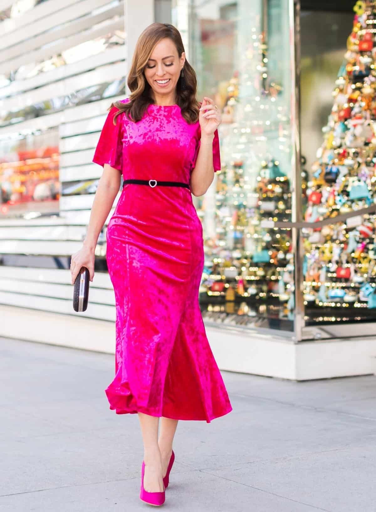 A bright velvet midi dress feels cheerful and festive. A belt defines the waist, while flutter sleeves add charm. Paired with matching heels, it’s a fun yet polished holiday look.