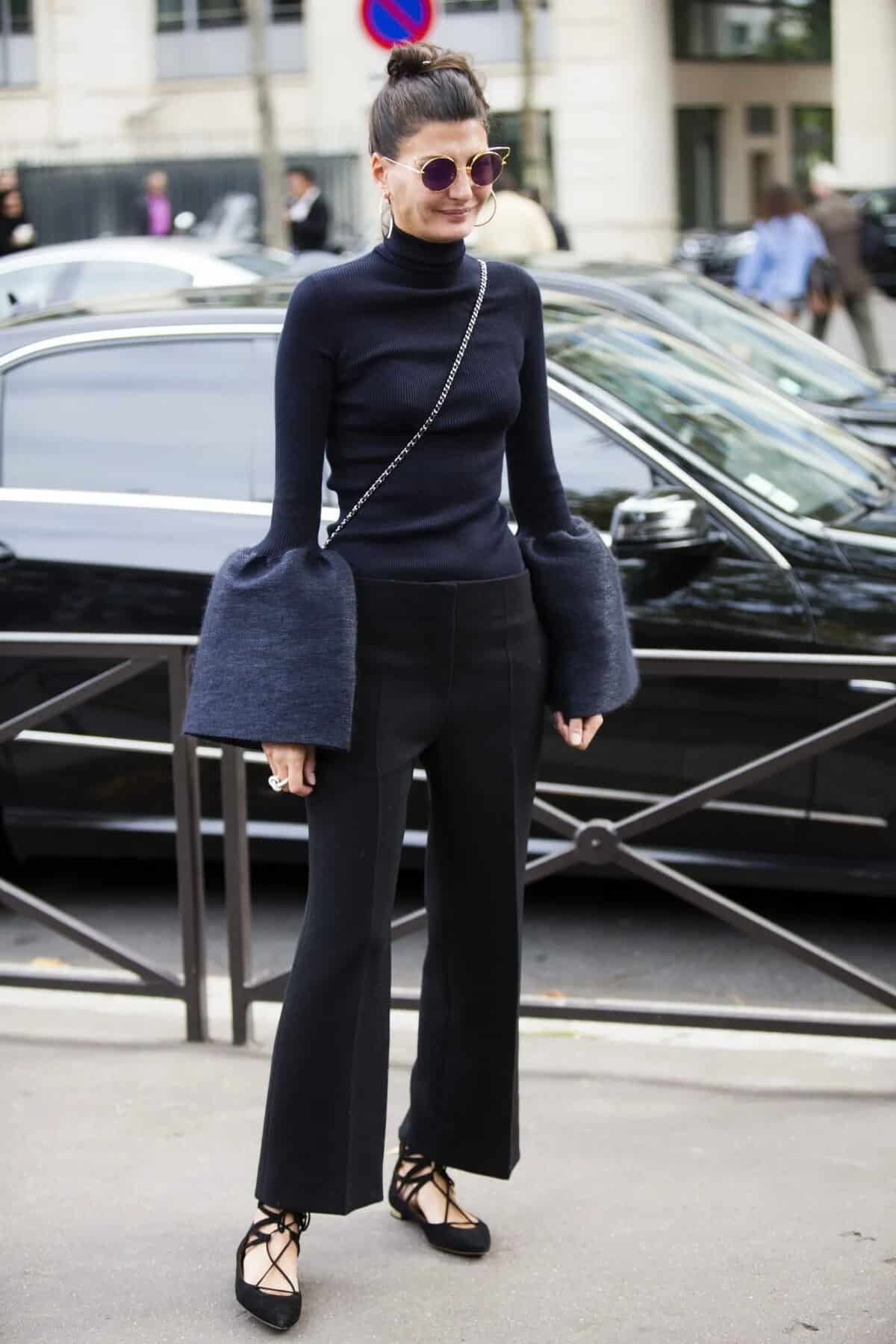 A fitted black turtleneck with dramatic sleeves adds fashion-forward flair. Wide-leg trousers keep the look sleek and confident. Minimal accessories allow the silhouette to stand out while staying refined