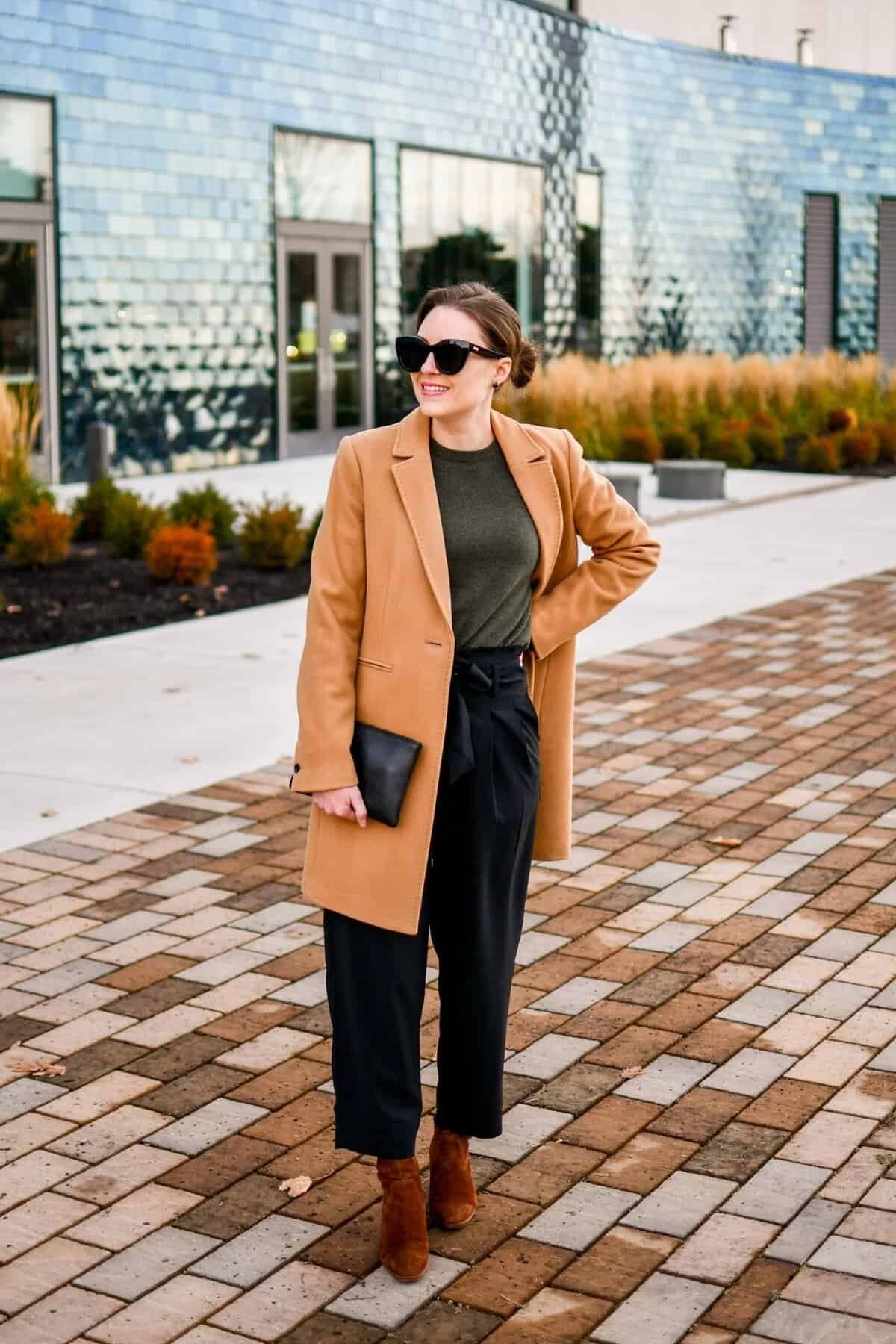 A camel coat adds warmth and elegance. Black trousers and a colored top keep the outfit polished. Finished with boots and a clutch, this look feels sophisticated and winter-ready.