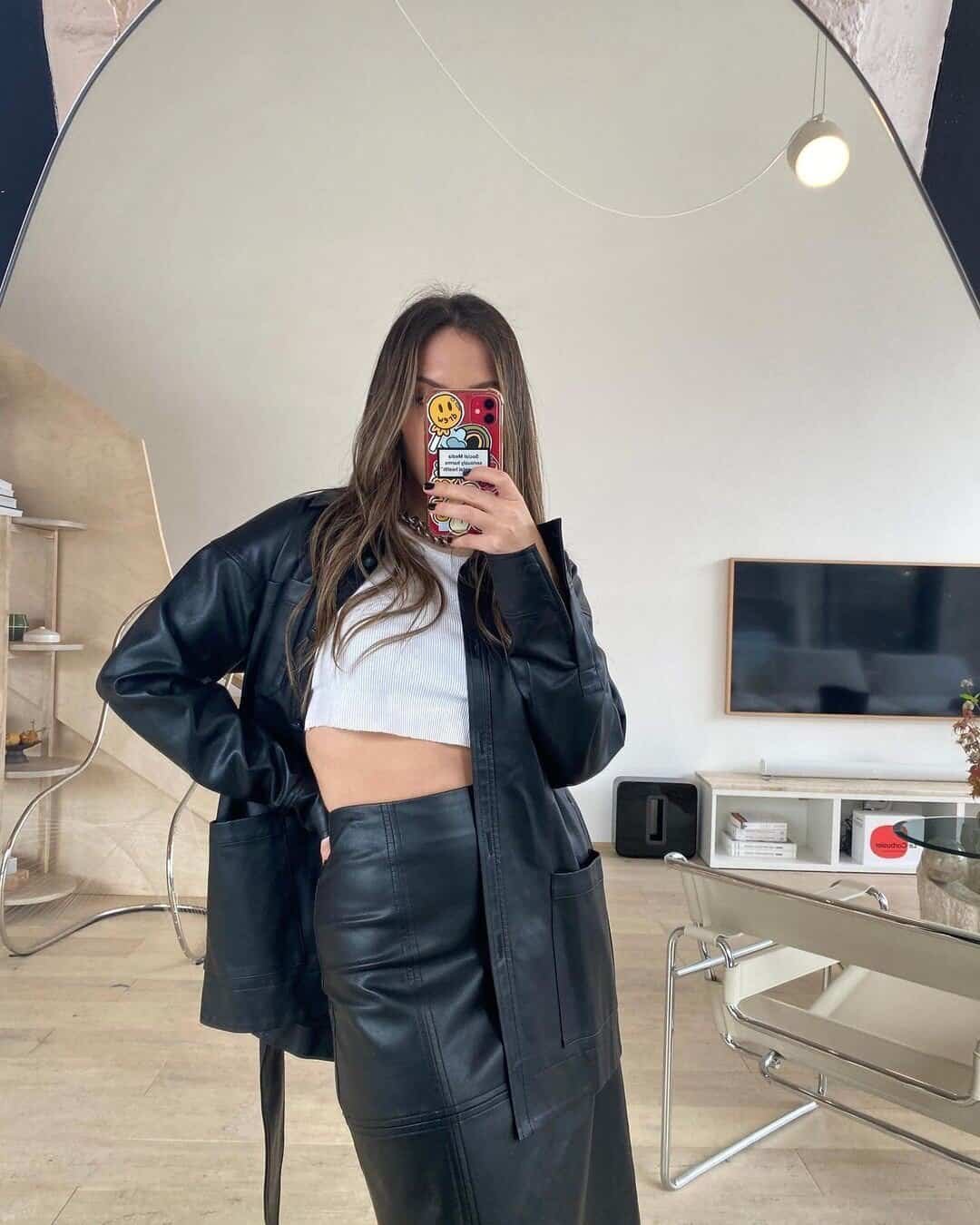 A leather jacket with leather pants creates a bold, modern base. A white crop top lightens the look, keeping it fashion-forward while still sleek and structured for a party setting.