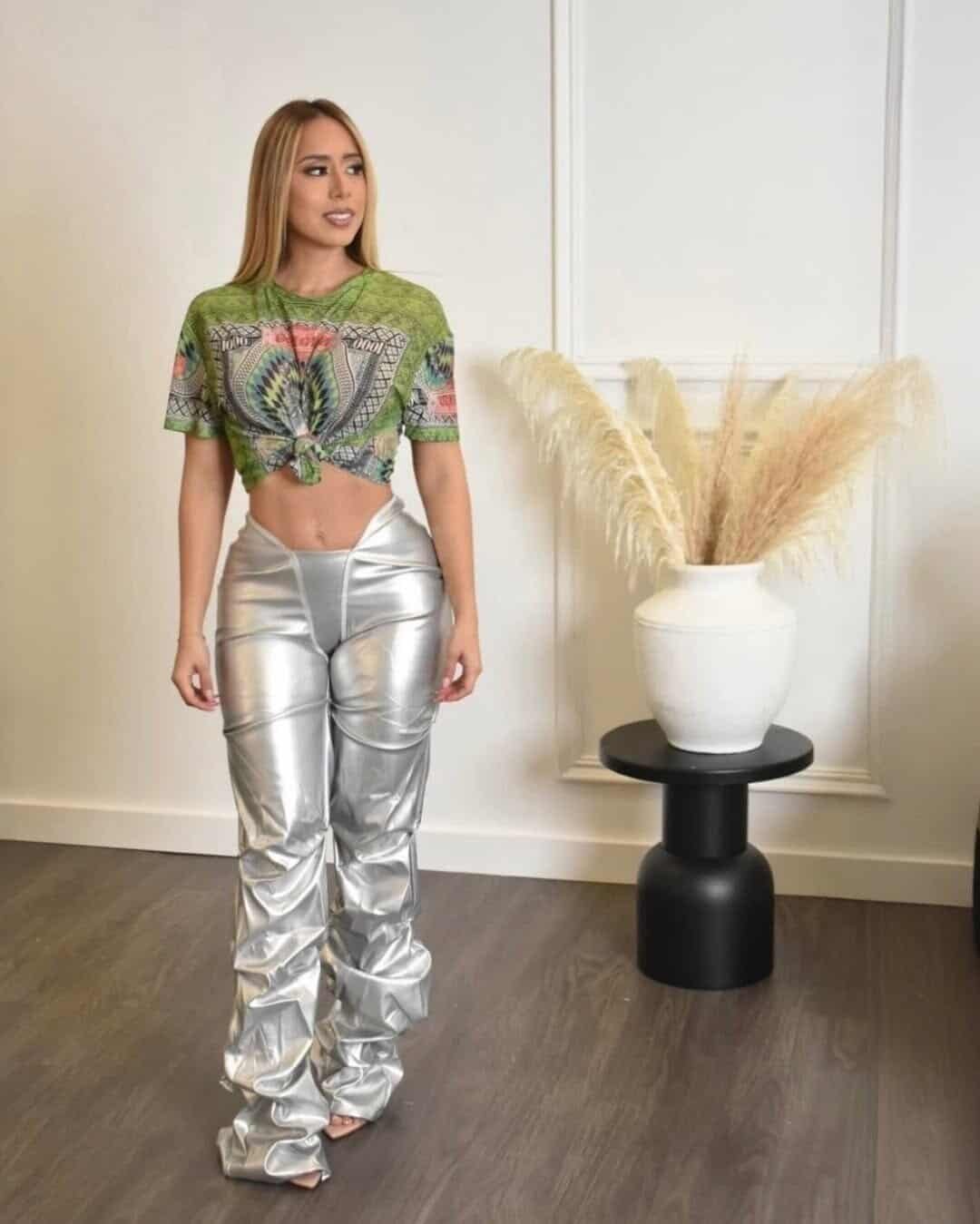 A patterned green crop top adds artistic flair while silver metallic pants bring futuristic shine, creating a contrast that feels unique and expressive. This combination allows comfort for dancing while reflecting Karol G’s eclectic and fearless fashion spirit.