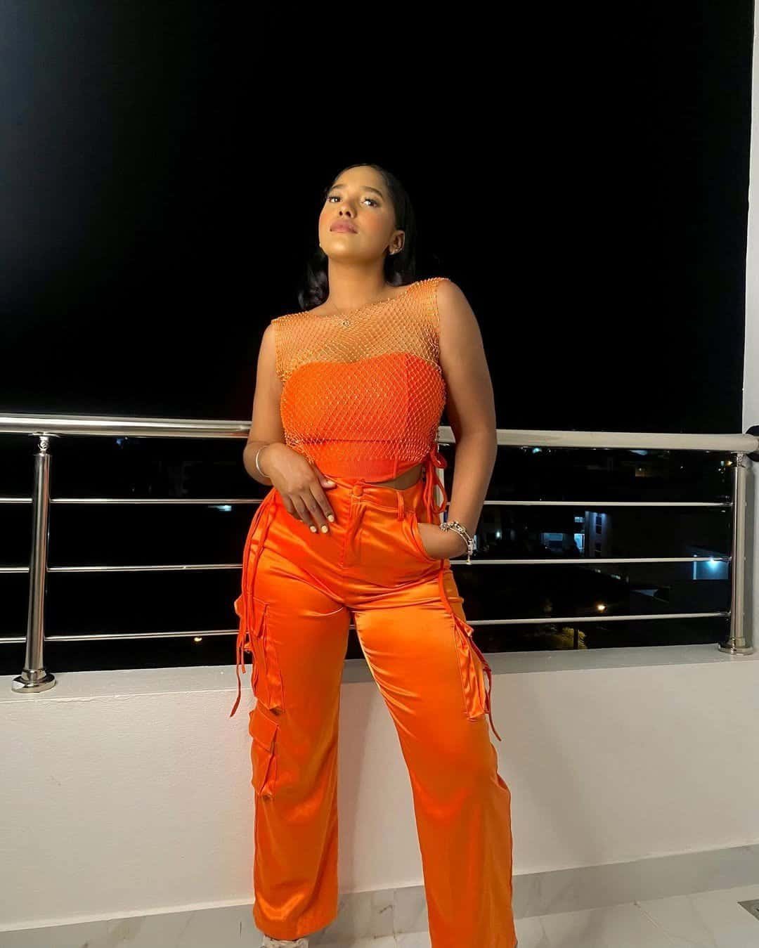 A daring orange mesh crop top paired with matching high-waisted cargo pants creates a powerful and fearless monochrome look. The relaxed fit keeps movement easy, while the bold color guarantees attention under concert lights.