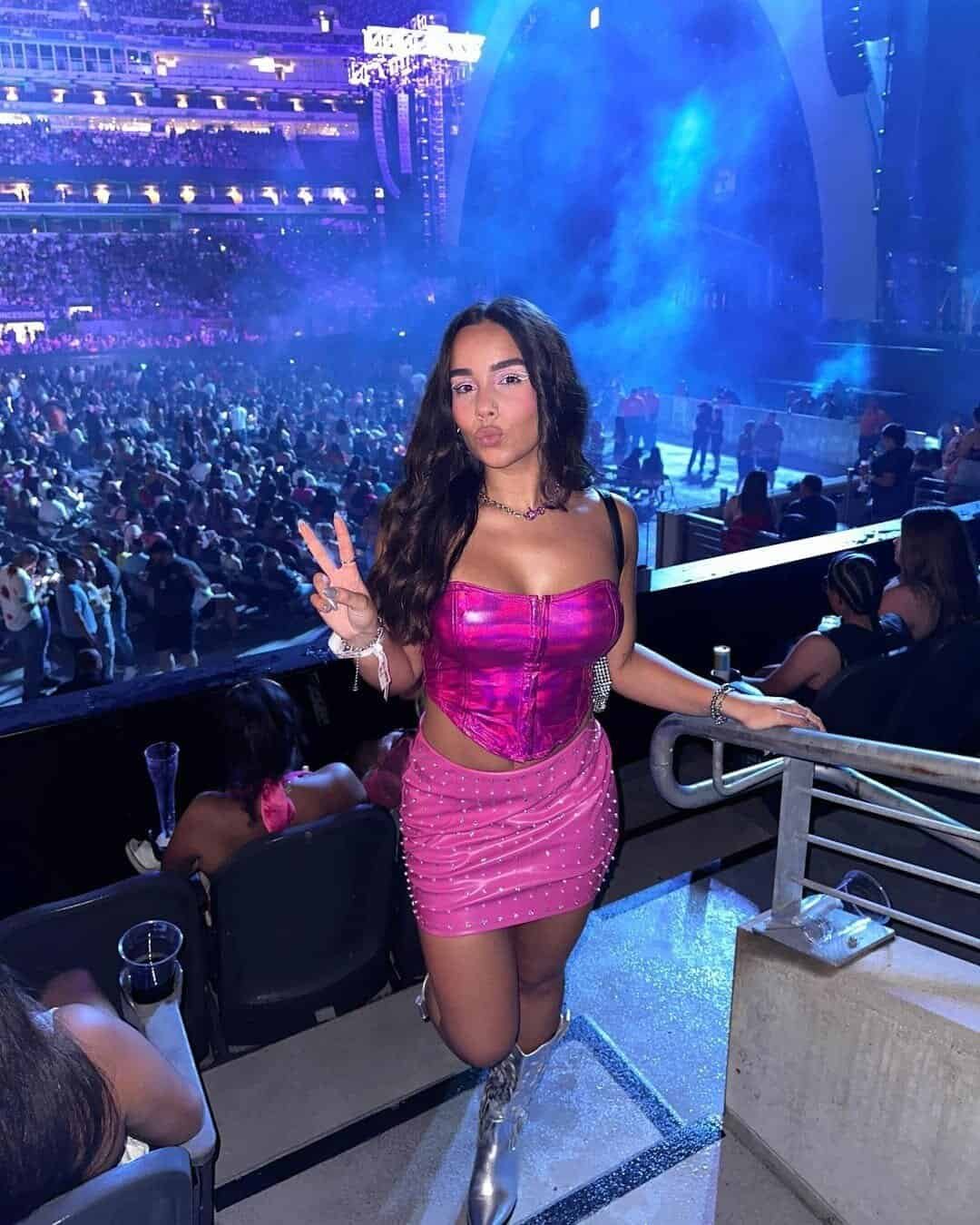 A metallic pink corset top and matching mini skirt create a futuristic and playful concert look. Silver boots and delicate jewelry finish an outfit that feels daring, energetic, and stage-inspired.