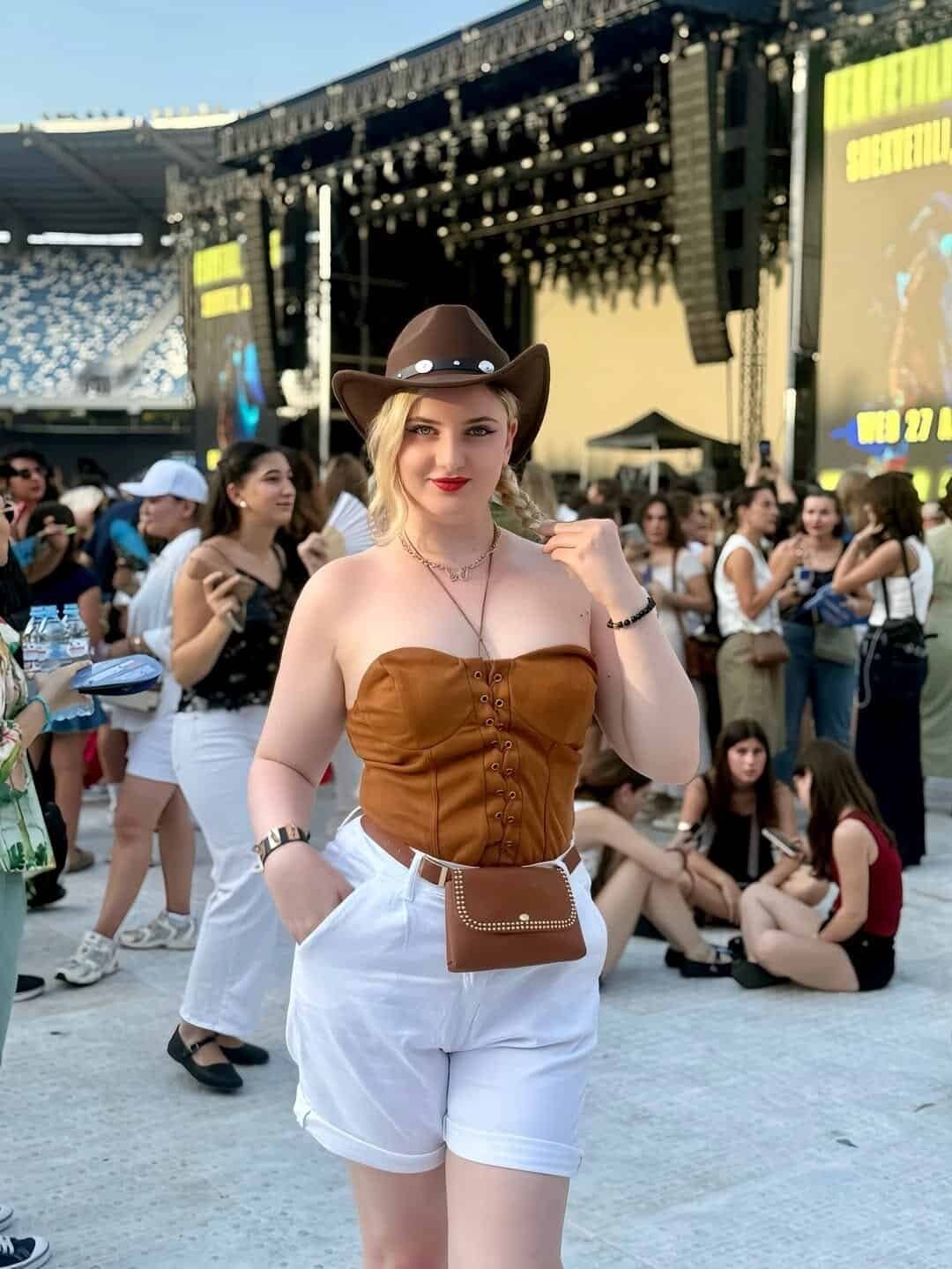 A brown corset top with white shorts delivers a fresh mix of western charm and modern style. A cowboy hat and belt bag complete a confident outfit that feels unique and crowd-catching.