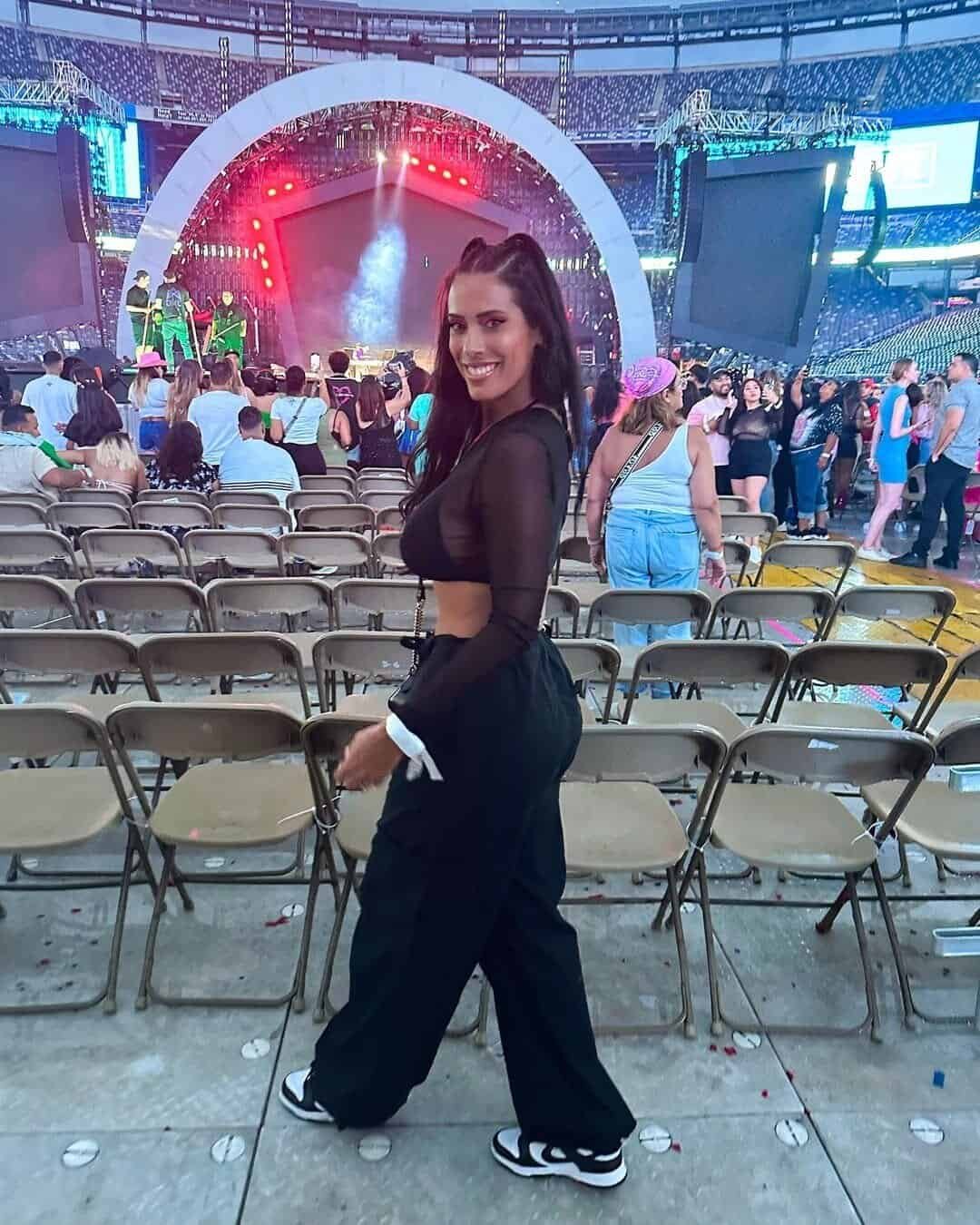 A simple black crop top paired with distressed jeans delivers a relaxed yet confident concert look. Chunky sneakers keep it comfortable for long hours, while a bright accessory adds a playful pop of color that reflects Karol G’s vibrant style.