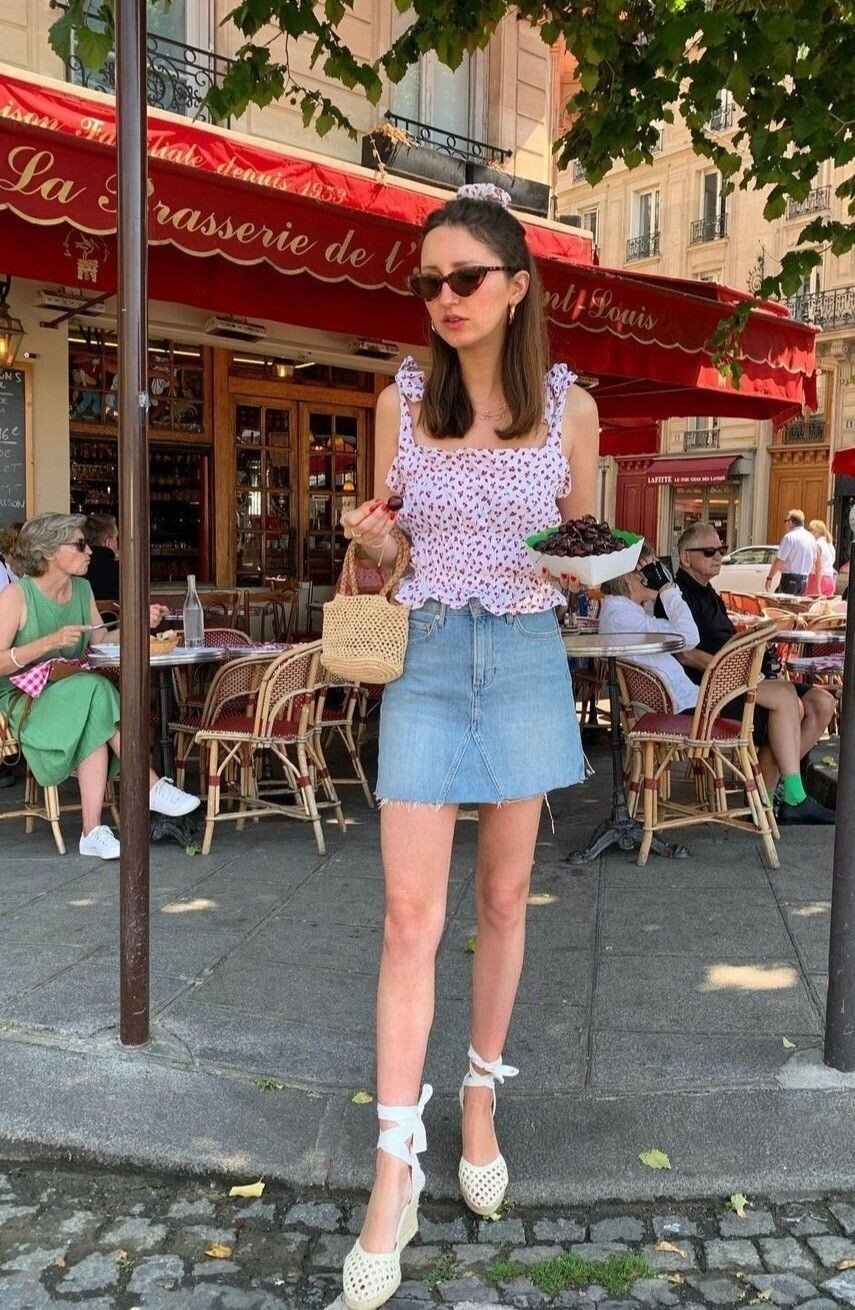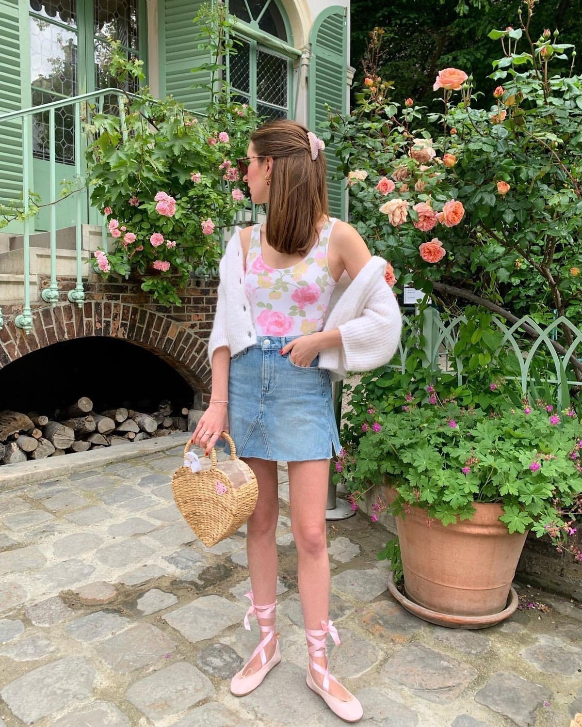 A soft pink floral tank layered under a chunky cream cardigan creates an easy romantic base. Pair it with a denim mini skirt for balance, then finish with ballet flats and a woven bag for a subtle, whimsical touch. It’s the kind of outfit that works just as well for brunch as it does for an afternoon stroll.