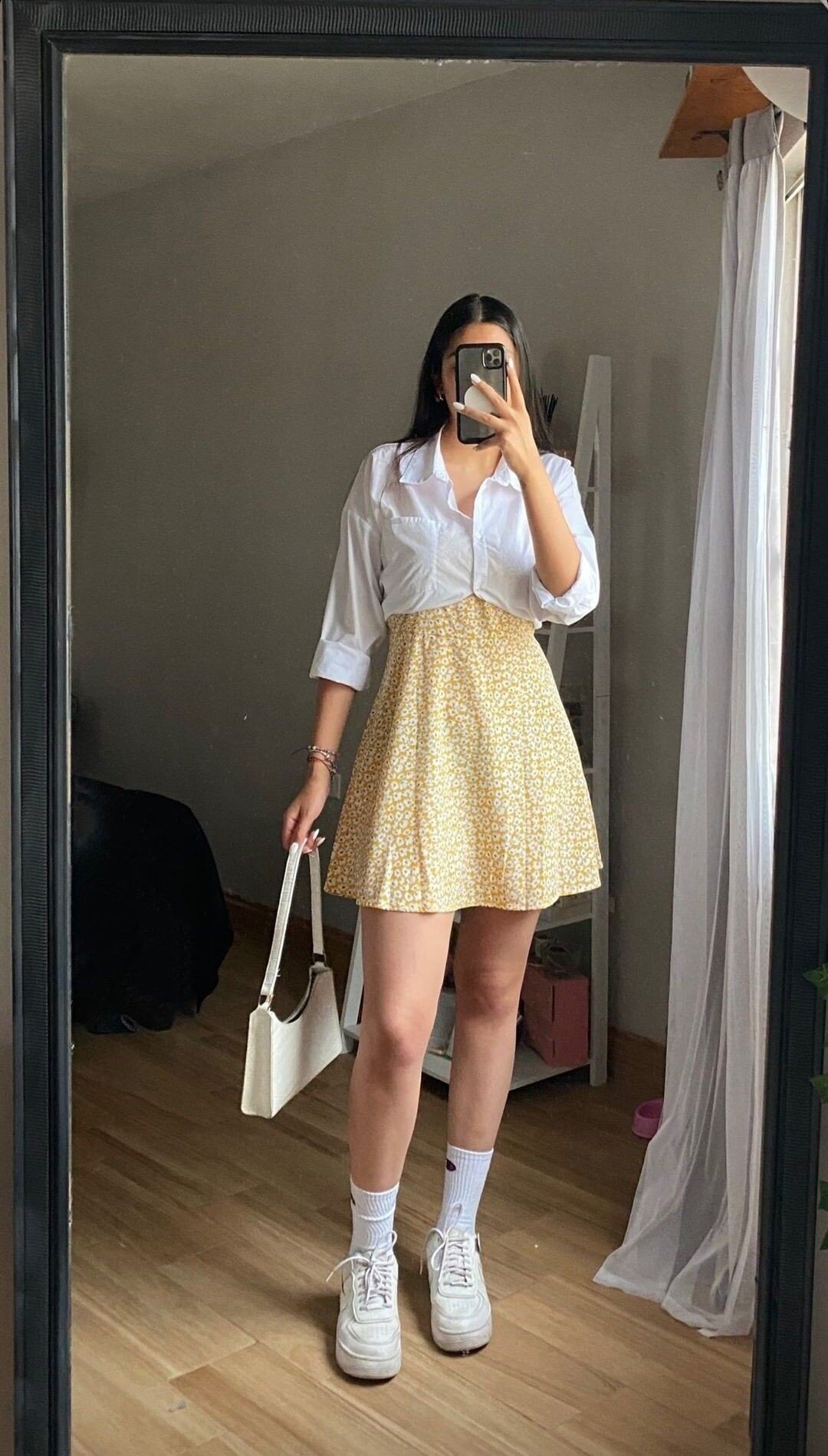 A crisp white button-down tucked into a butter-yellow floral A-line skirt gives polished but relaxed energy. Add white platform sneakers with crew socks to keep it modern, and carry a neutral tote for practicality. It feels intentional without looking like you tried too hard.
