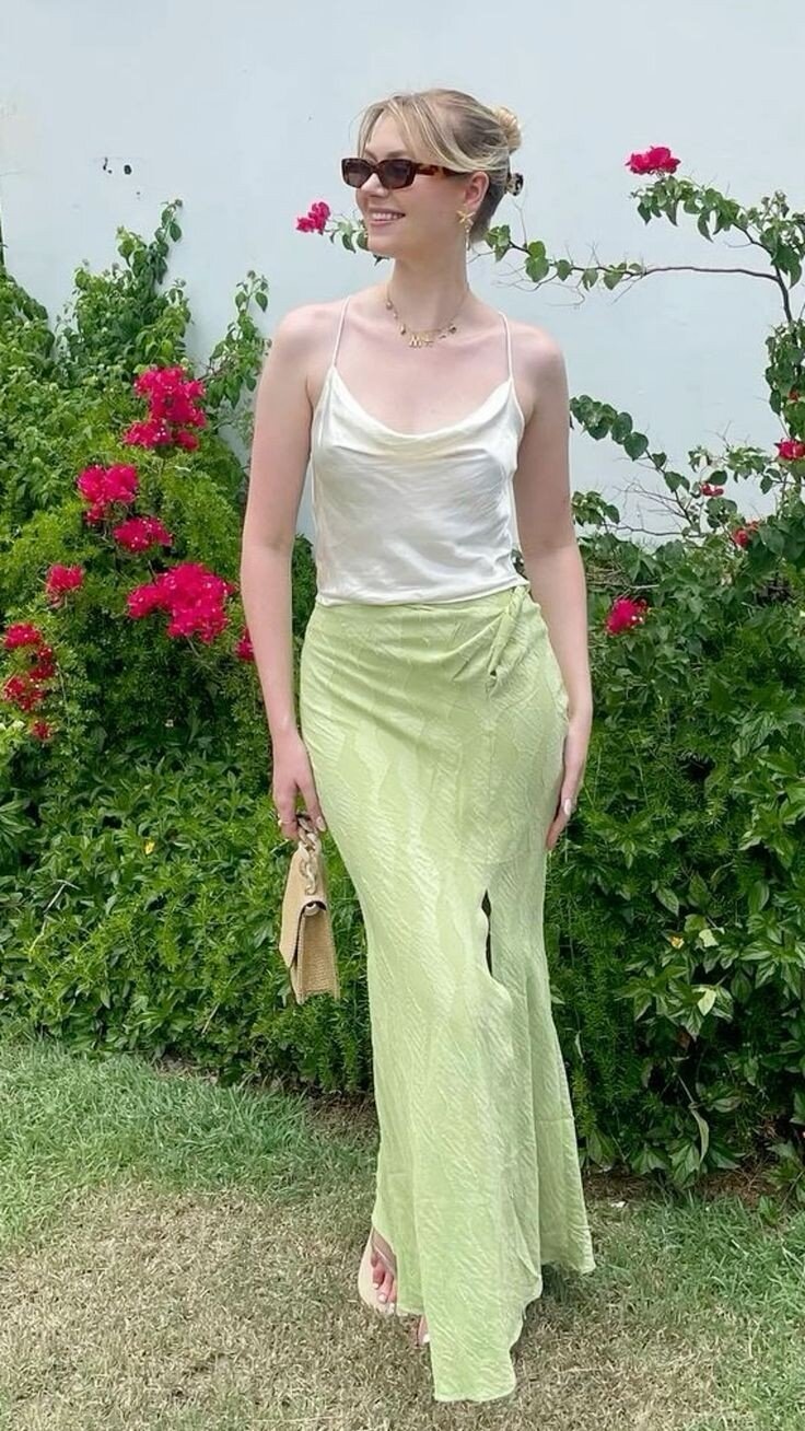 A silky cream camisole paired with a pistachio linen maxi skirt is the definition of effortless elegance. The mix of soft shine and breathable texture makes this ideal for garden gatherings or slow brunch dates. Add a lightweight linen shirt for layering into the evening.