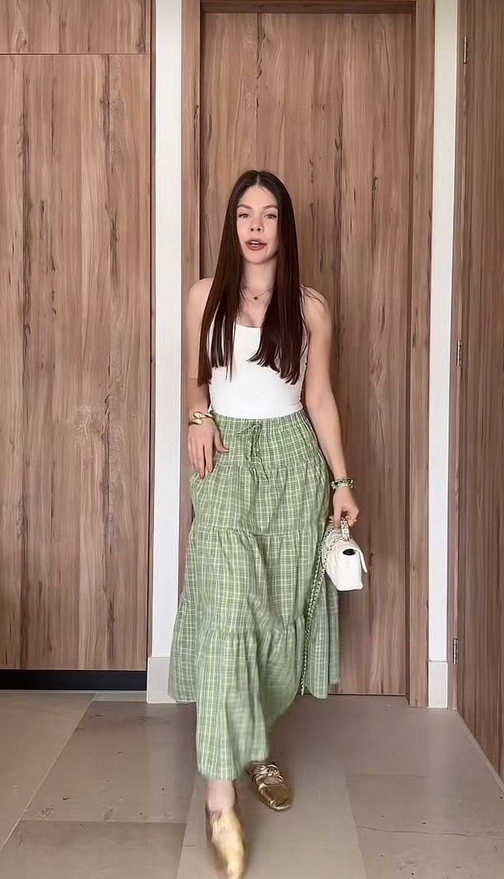 A sage green gingham midi skirt with a gathered waist creates movement and softness. Pair it with a simple white tank and structured cream handbag to keep the look clean and balanced. Delicate gold jewelry finishes it beautifully.