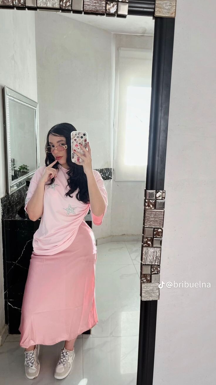 A soft pink tee tucked into a matching midi skirt creates a coordinated yet relaxed outfit. White chunky sneakers keep it from feeling overly sweet, and simple accessories maintain that soft summer harmony.