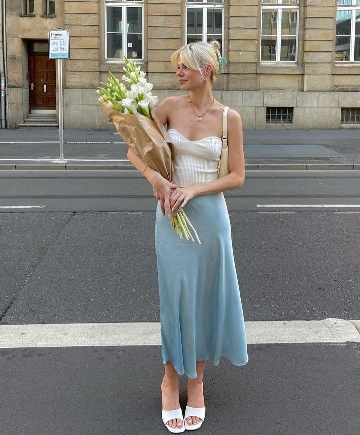 A cream sweetheart-neckline tank paired with a pale blue midi skirt feels light and polished. White slide sandals keep the look minimal, while delicate jewelry allows the muted palette to shine.