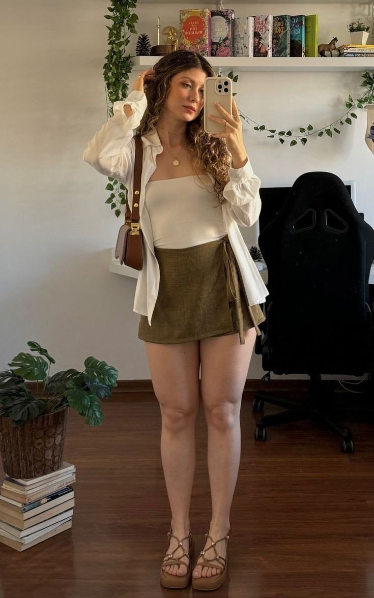 An oversized cream linen shirt layered over a fitted tank with an olive linen mini skirt feels airy and refined. Brown leather accessories ground the soft tones, creating a cohesive and wearable summer uniform.