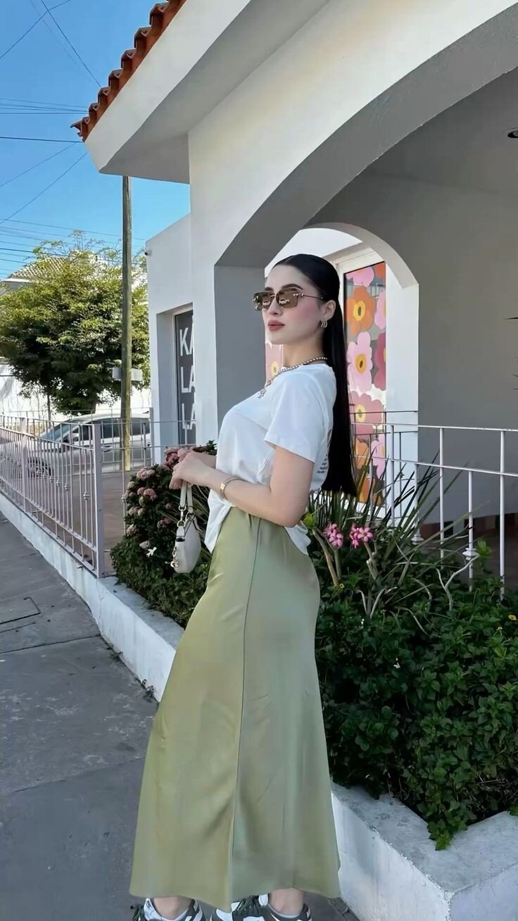 A pale sage midi skirt paired with a classic white t-shirt proves that soft summer dressing doesn’t need complicated layers. Chunky sneakers add comfort, while pearl jewelry introduces a subtle elegance.