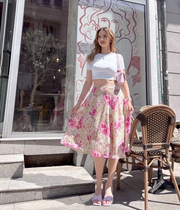 A romantic pink floral midi skirt styled with a crisp white crop top feels nostalgic yet fresh. Pastel slides keep it comfortable, and a lightweight cardigan draped over the shoulders adds an effortless preppy finish.