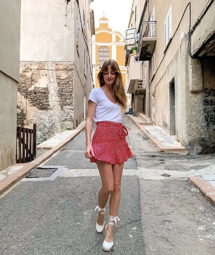 A printed red A-line mini skirt transforms a simple white tee into a statement outfit. Platform sneakers or sandals keep it casual, while the soft print prevents the red from feeling too bold.