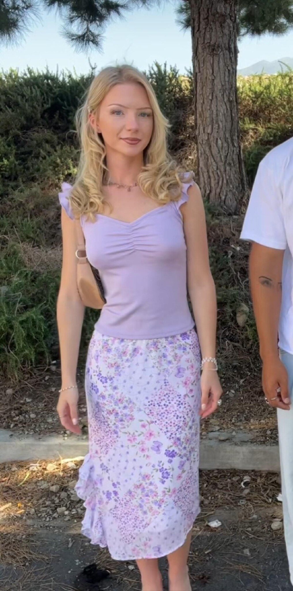 A fitted lavender top with delicate ruffled sleeves styled alongside a coordinating floral midi skirt creates a cohesive, romantic ensemble. Minimal jewelry keeps the look refined and wearable for everyday occasions.